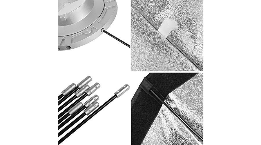 - The soft box is black outside and silver inside with even coating, high reflection.