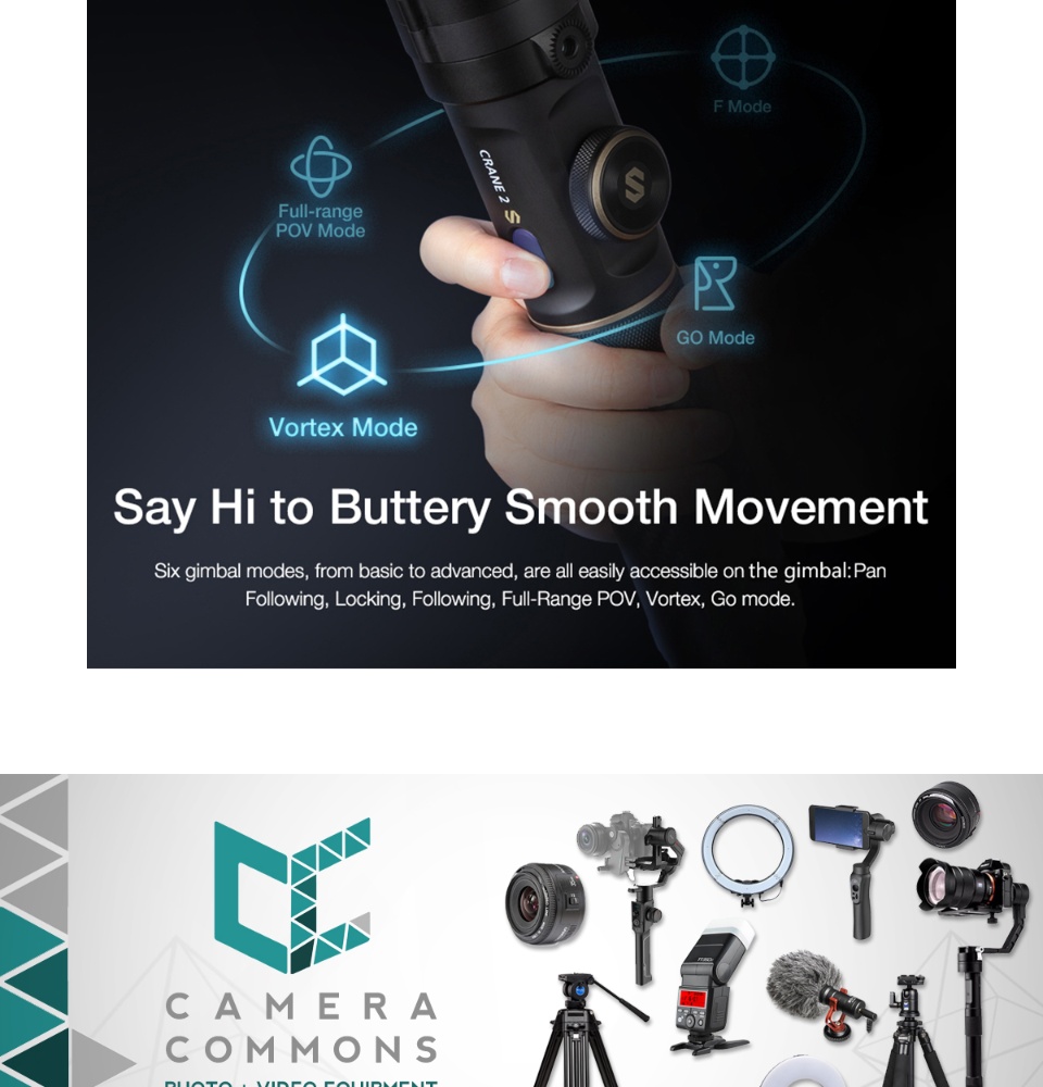- Six modes: pan follow, lock, follow, full-range POV, vortex, and Go modes