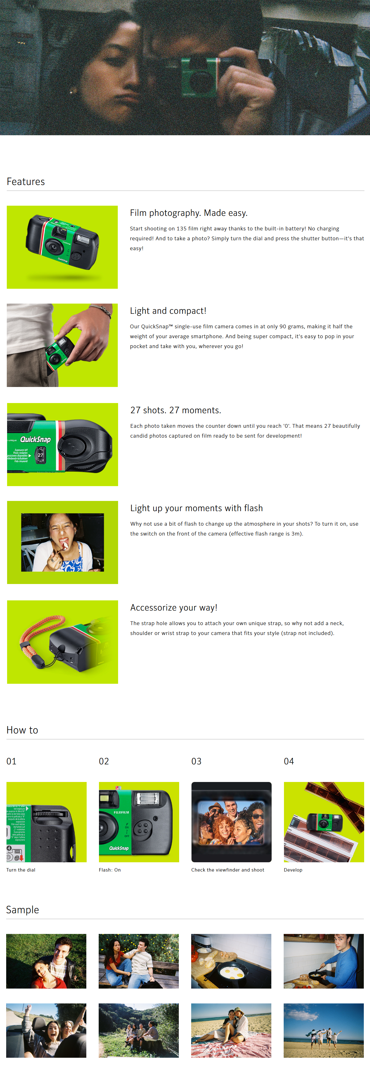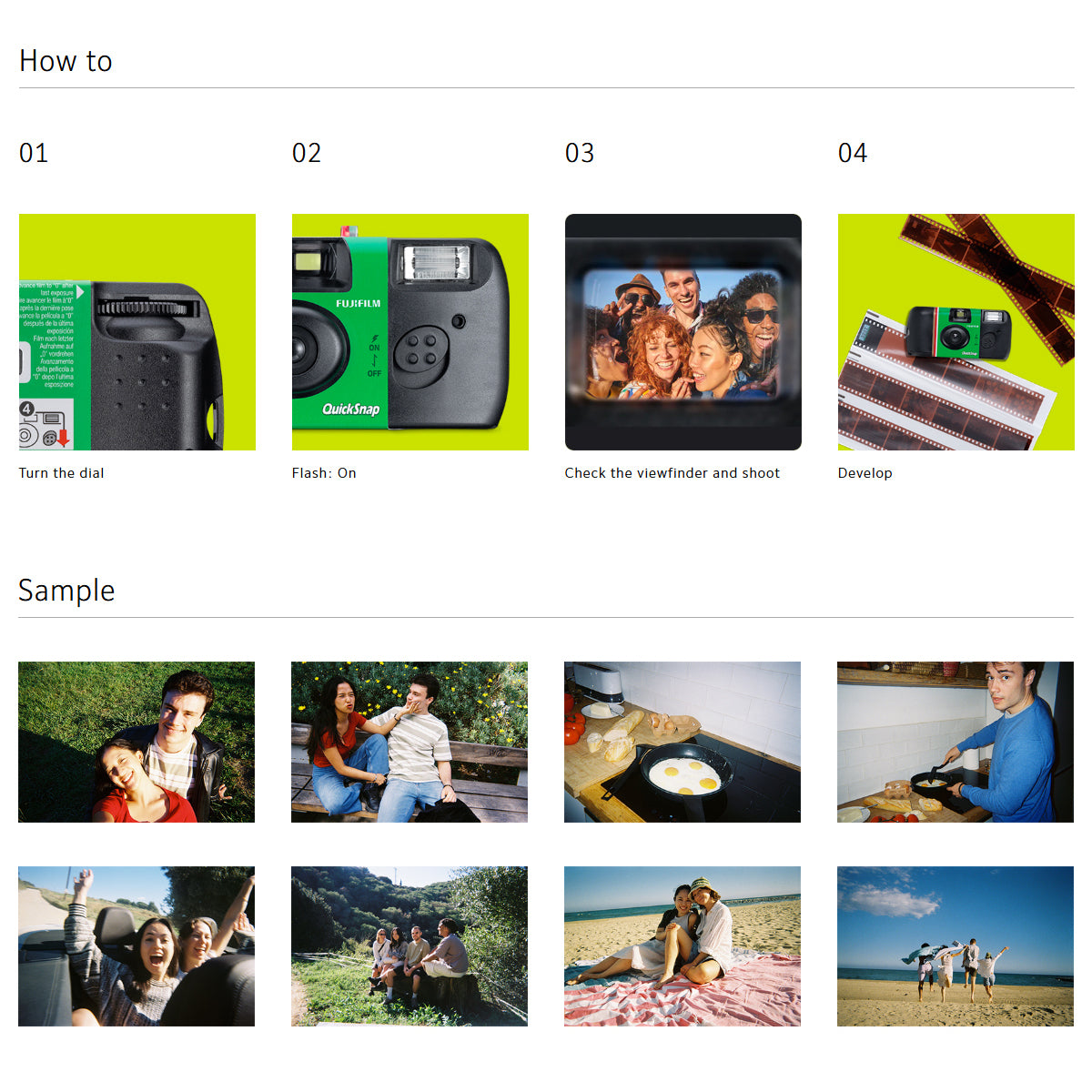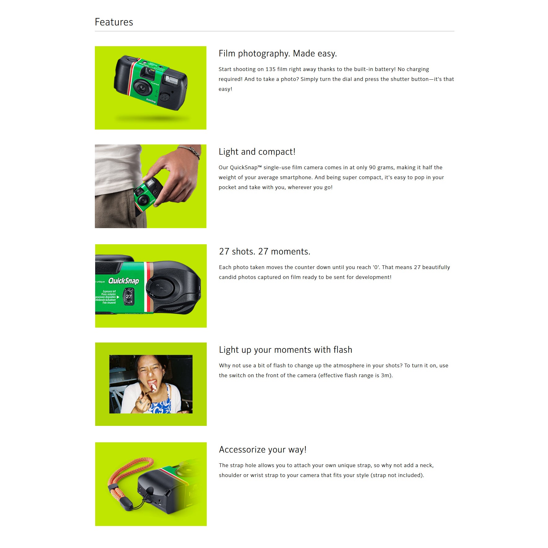 - A convenient one-time-use disposable camera for both indoor and outdoor shooting situations, the QuickSnap Flash 400 from FUJIFILM is loaded with a roll of 27-exposure Fujicolor Superia X-TRA 400 color negative film for bright, vivid results in a variety of lighting conditions.