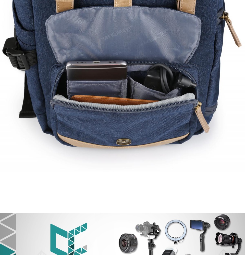 • Front pocket, side pocket (with mesh pocket) and top pocket can hold filters, data cables or cleaning kit.