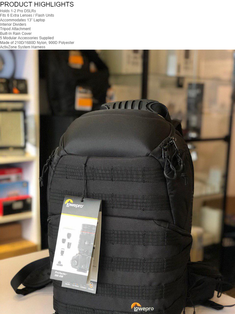 • Lowepro ProTactic 350 AW Backpack for Laptop and Camera Gears