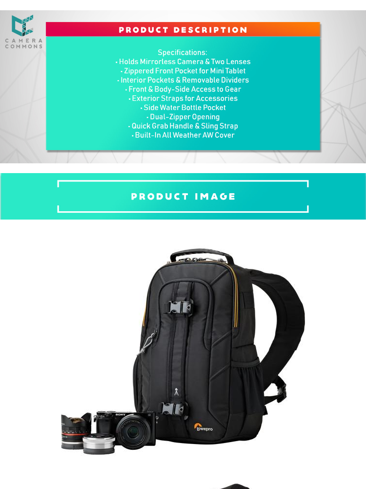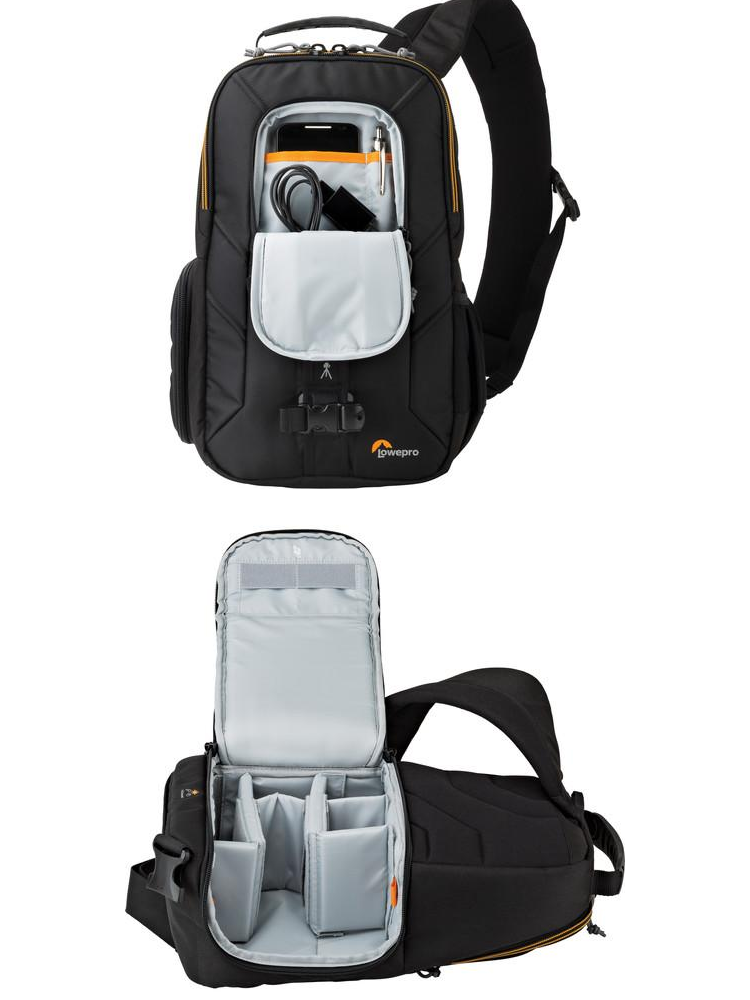 • Designed for urban environments or exotic travel adventures, this slim and secure sling can hold a mirrorless camera, two lenses in the padded main compartment and a mini tablet in a zippered front pocket.
