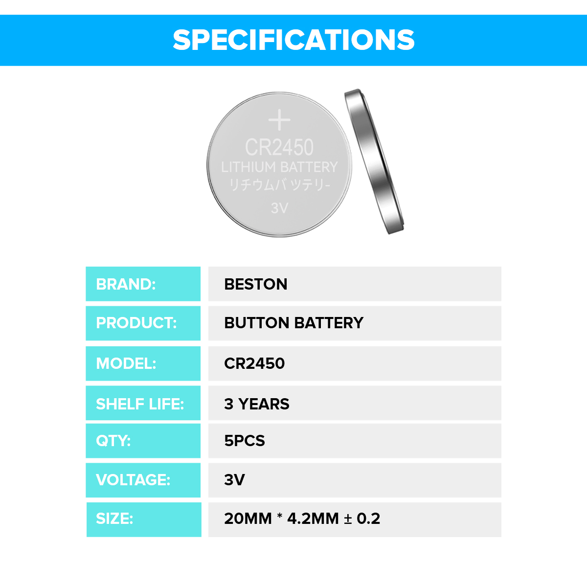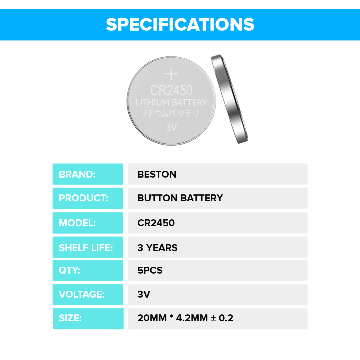 Beston CR2450 Button Cell Lithium Battery Li-ion Coin 3V 3 Volts (Pack of 5)