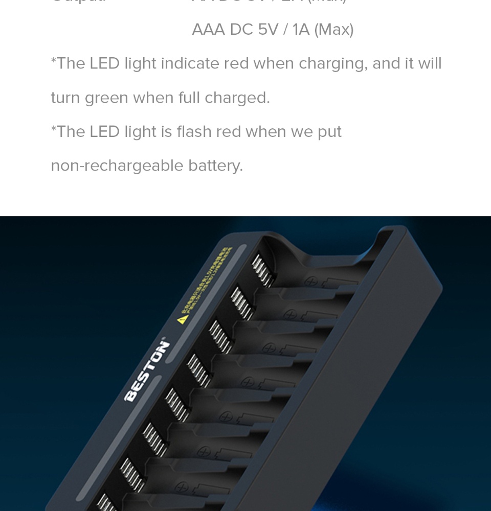 - Output: AA DC 5V / 2A (Max) and AAA DC 5V / 1A (Max)