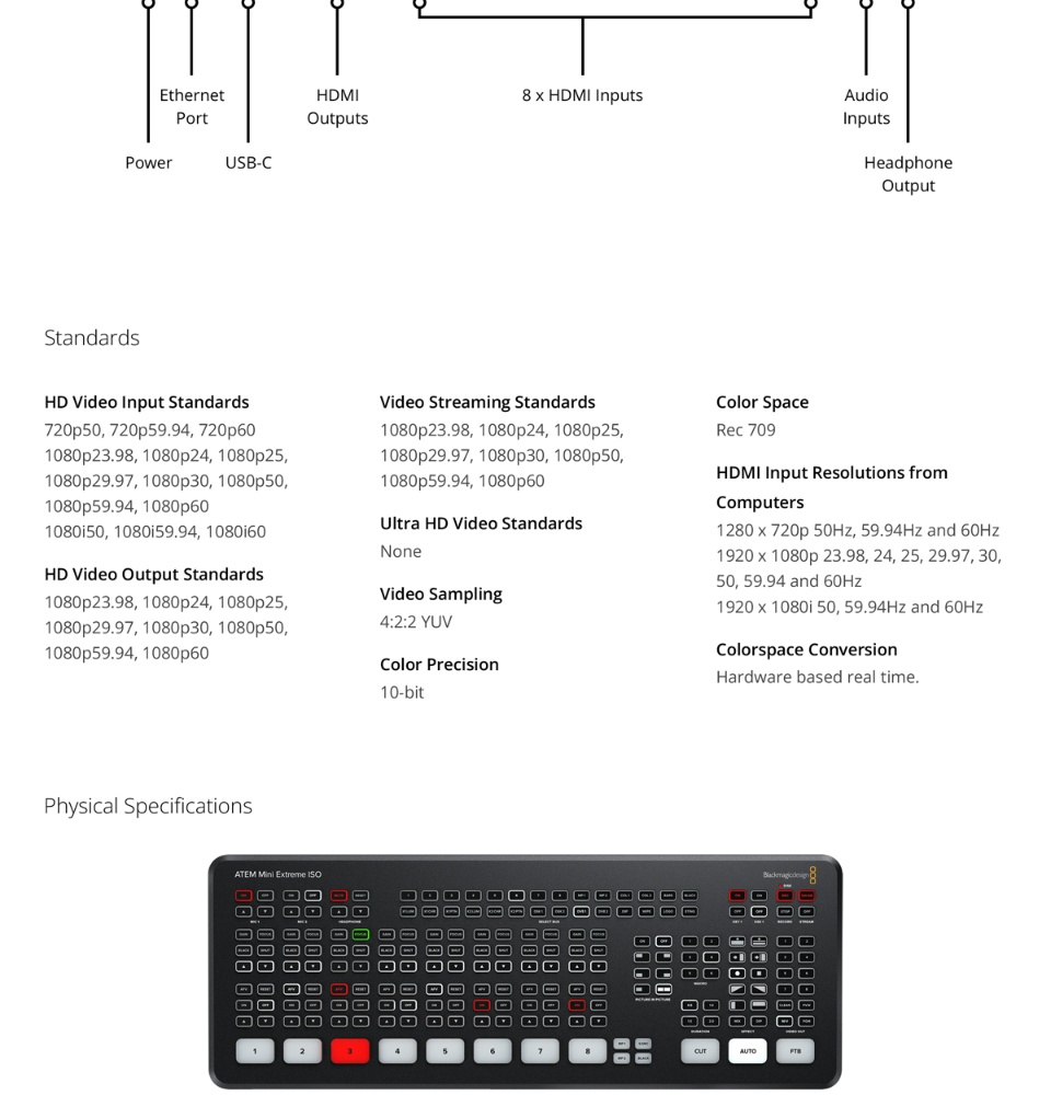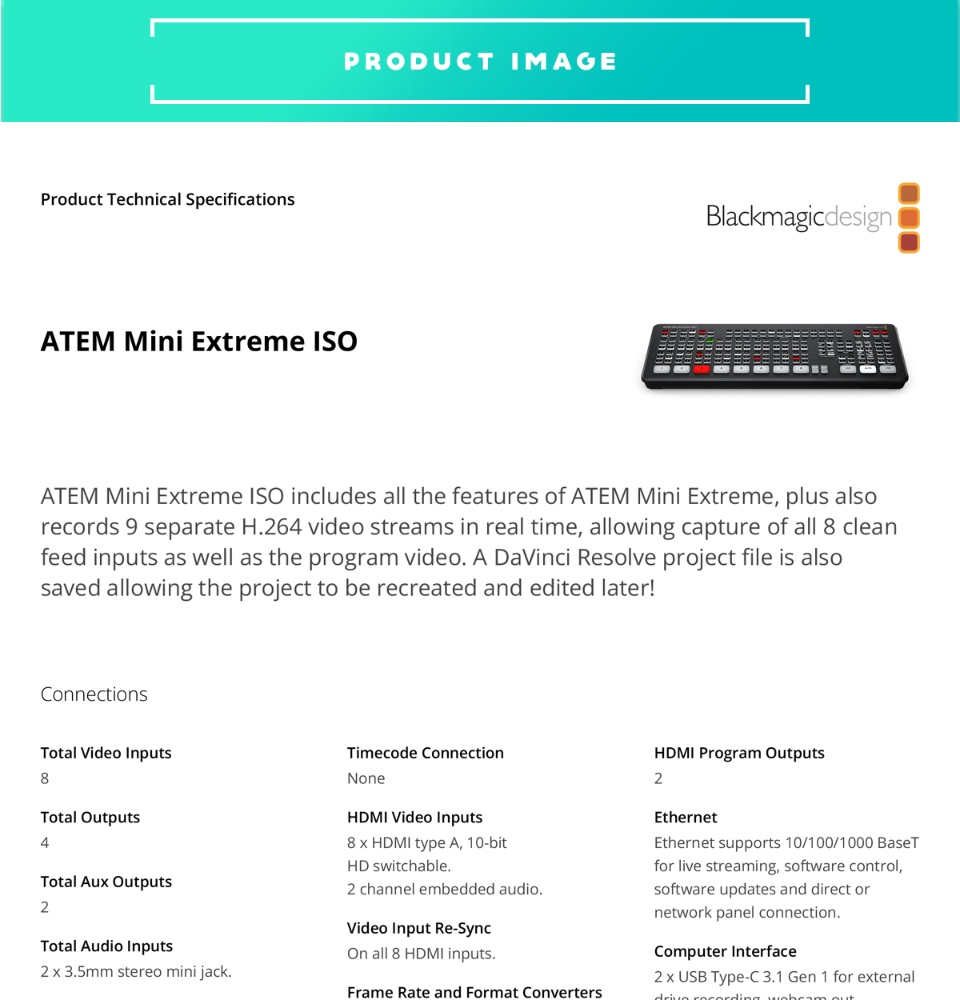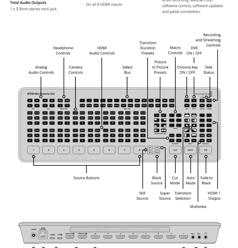 • Compatibility - It includes the ATEM Software Control Panel, and it is also compatible with the ATEM 1 M/E, ATEM 2 M/E, and ATEM 4 M/E Advanced Panels. The ATEM Mini Extreme ISO can be configured using Blackmagic's Videohub Hardware Panel Setup utility to route sources to destinations using Videohub Smart Control Pro and Videohub Master Control Pro.