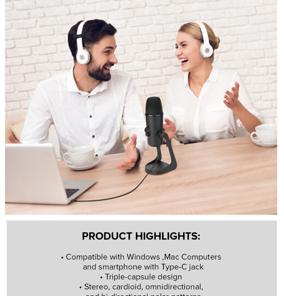 - The multiple mic modes allow virtually any kind of content creator to do their thing with precision and ease. Use Cardioid to reject off axis noise, minimizing room tone while you speak directly into the mic. If you're recording with one other guest, select the Bidirectional polar pattern; now you can speak into the front, while the guest speaks into the back, and the sides of the mic will reject unwanted room noise. Choose Omnidirectional to pick up audio all around the capsule, which is great for work that features multiple voices. Finally, a Stereo mode is wonderful for ASMR content, or for recording music. A desktop stand and a USB cable are included.