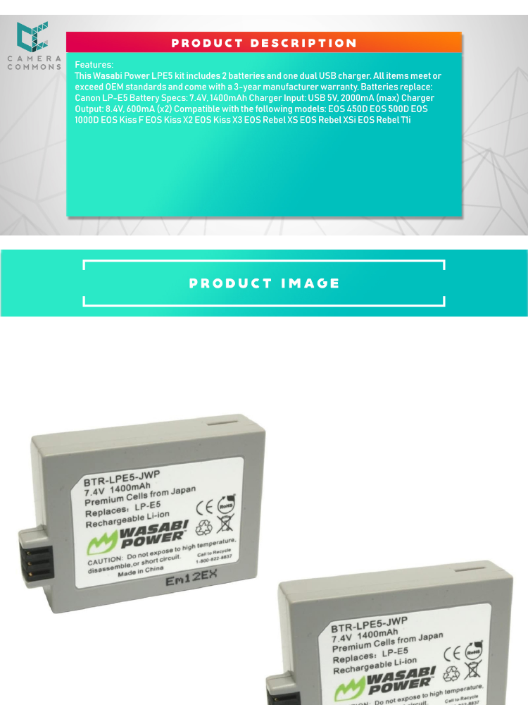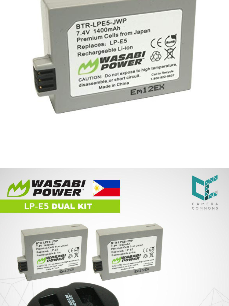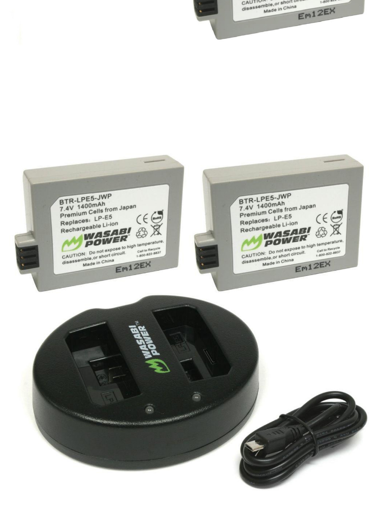 - Includes 2 batteries and 1 dual USB charger for the Canon LP-E5