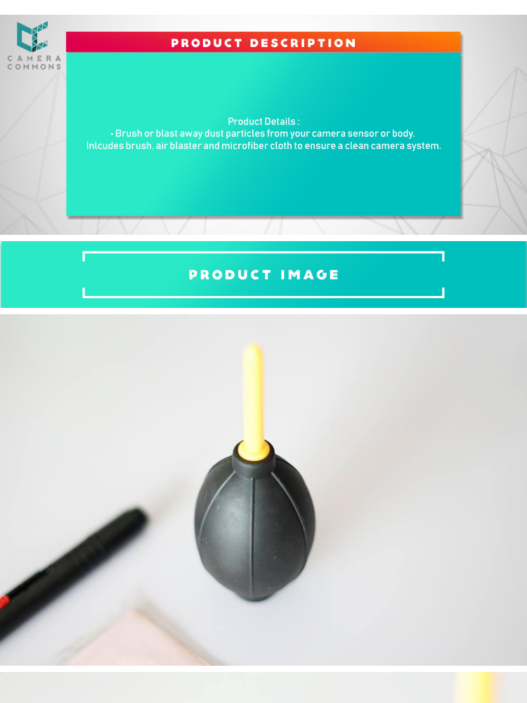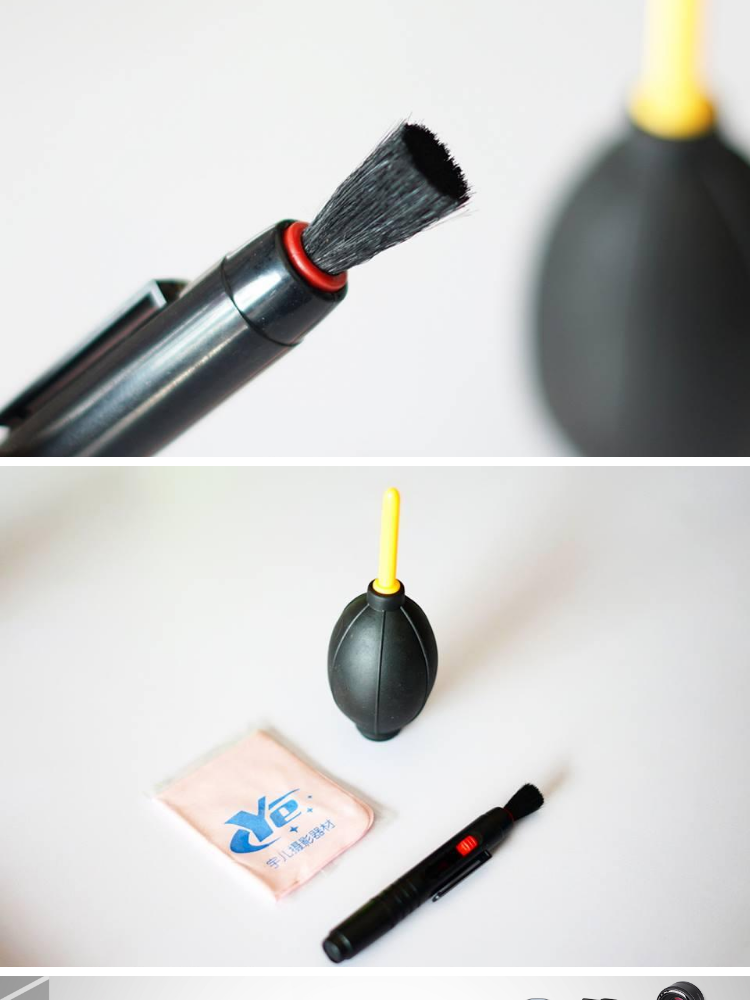 - Brush or blast away dust particles from your camera sensor or body. Inlcudes brush, air blaster and microfiber cloth to ensure a clean camera system.