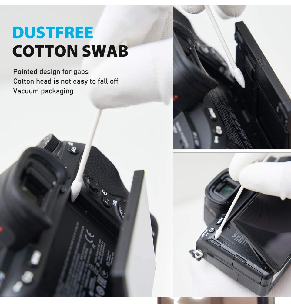 - Dustfree cotton swab: designed for cleaning up the dirt and dusts inside the gaps of the hot shoe, zoom rings, touch sports and other areas being difficult to clean.