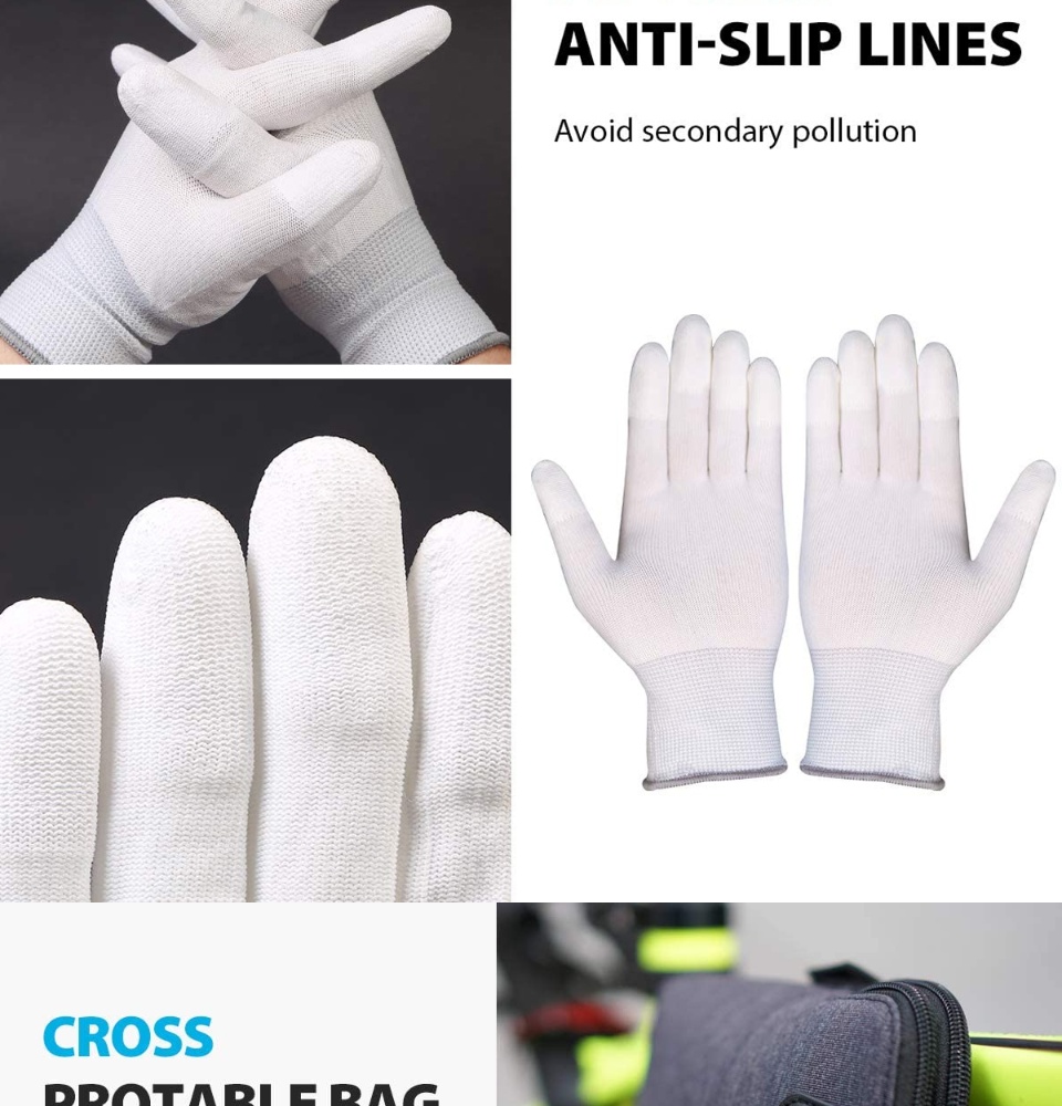 - Non-slip dust proof gloves: suitable for lens replacement and camera protection when cleaning the camera to prevent from falling or toughing the lens.