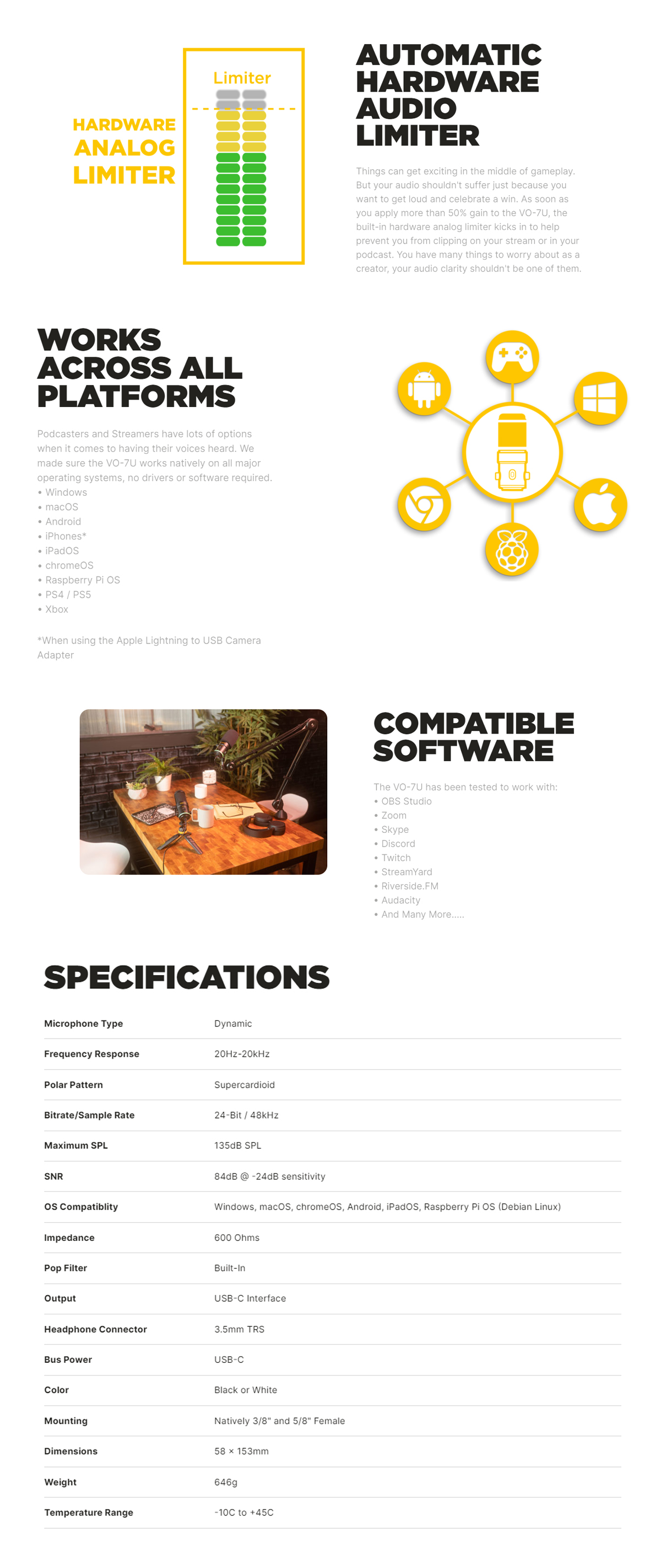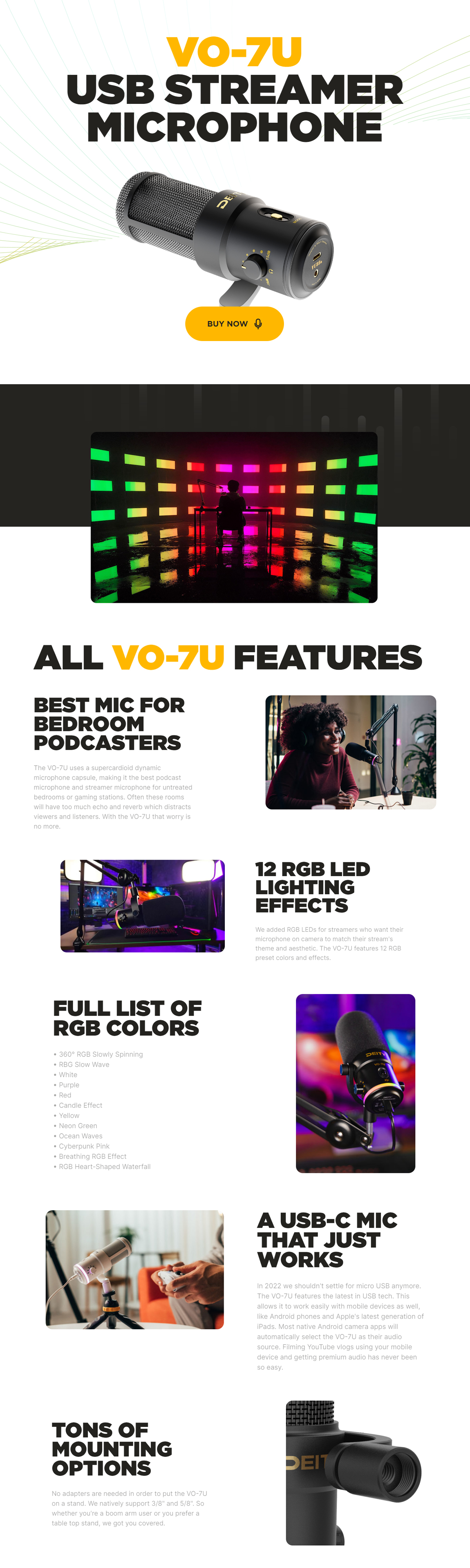• Level up your podcasting, gaming, and streaming with the black VO-7U Dynamic Supercardioid USB Streamer Microphone Kit from Deity. Engineered specifically to compensate for the poor acoustics in untreated home studios and workspaces, the mic features a large-diaphragm dynamic capsule that picks up less unwanted background sources further from the mic. In addition, its supercardioid polar pattern focuses audio capture tightly on the subject directly in front of the mic, further reducing unwanted background sound and picking up less room reverberations and reflections for clearer, more intelligible speech and voiceover work.