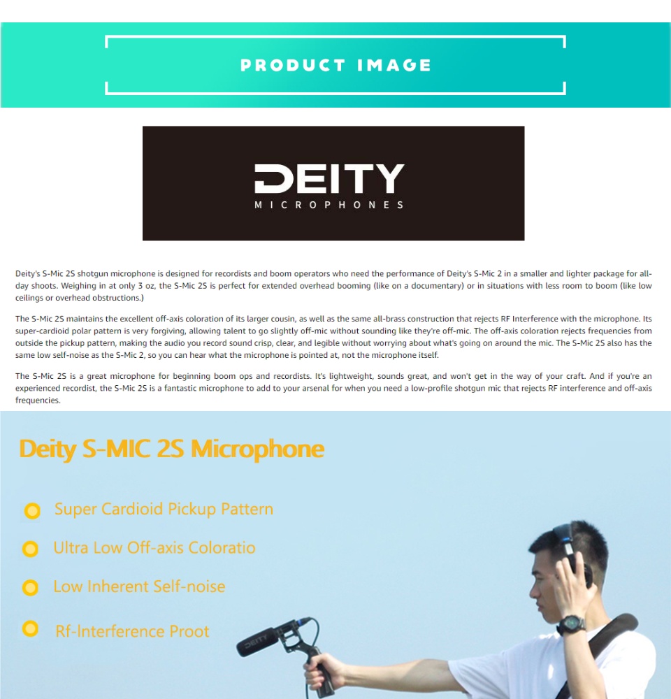 - Upgraded from Deity S-mic 2, the Deity S-Mic 2 is a professional shotgun mic features a shorter, lighter body with a slightly wider pickup pattern for multi-talent scenes. This makes it the S-Mic 2S perfect for things like reality TV crews, indoor sit down interviews, and indy filmmaking