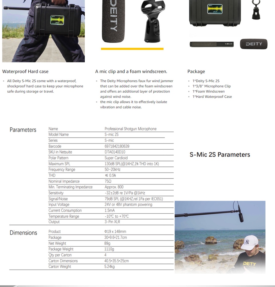 - All Deity S-Mic 2S come with a waterproof, shockproof hard case to keep your microphone safe during storage or travel. Also included with ever purchase is a mic clip and a foam windscreen