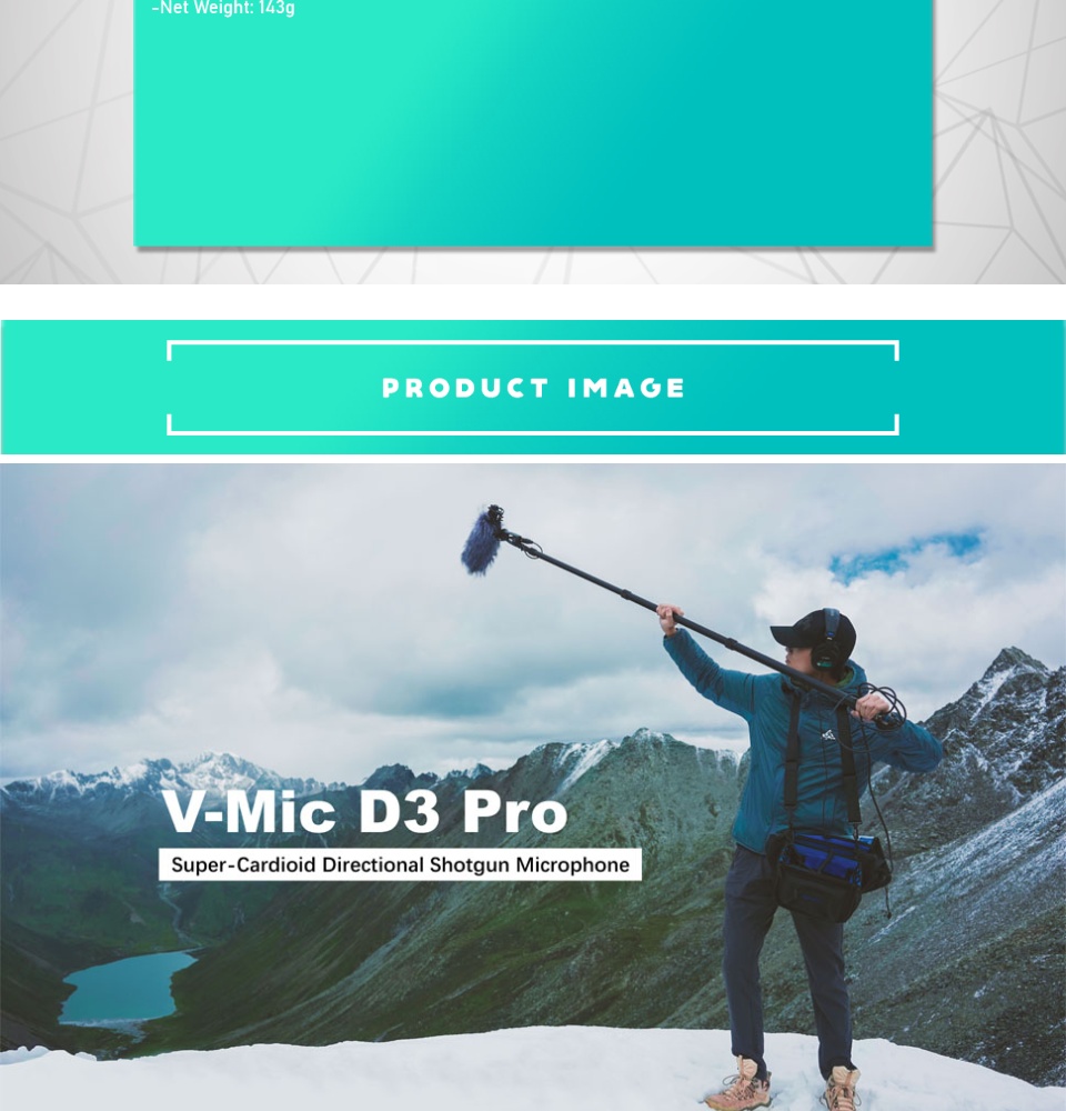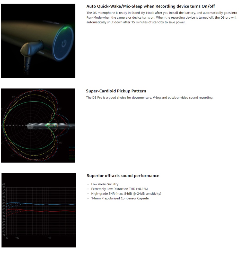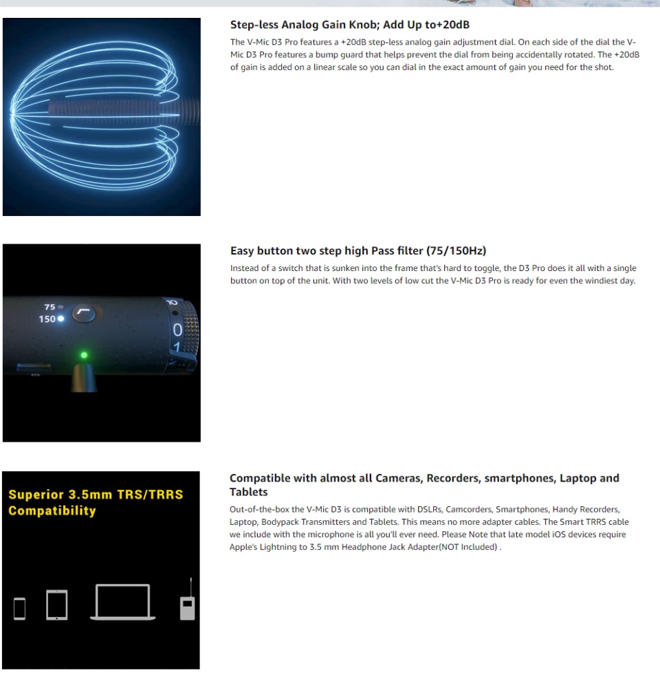 - The World's Only Microphone with a Stepless Gain Knob|: The V-Mic D3 Pro features a +20dB step-less analog gain adjustment dial. On each side of the dial the V-Mic D3 Pro features a bump guard that helps prevent the dial from being accidentally rotated. The +20dB of gain is added on a linear scale so you can dial in the exact amount of gain you need for the shot