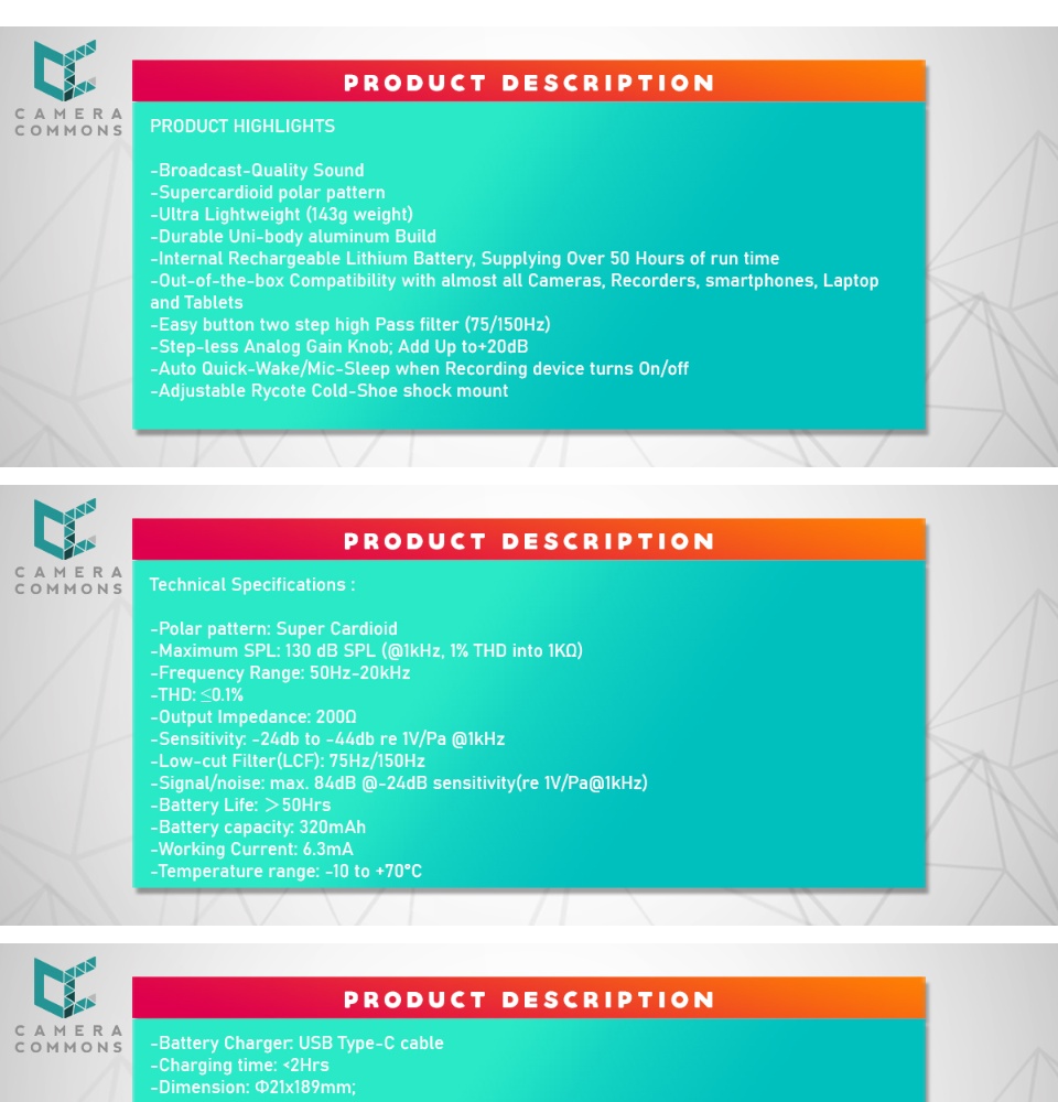 - Broadcast Quality Sound|: Superior off-axis sound performance. Low noise circuitry, Extremely Low Distortion THD (<0.1%), High-grade SNR (max. 84dB @-24dB sensitivity), 14mm Prepolarized Condensor Capsule