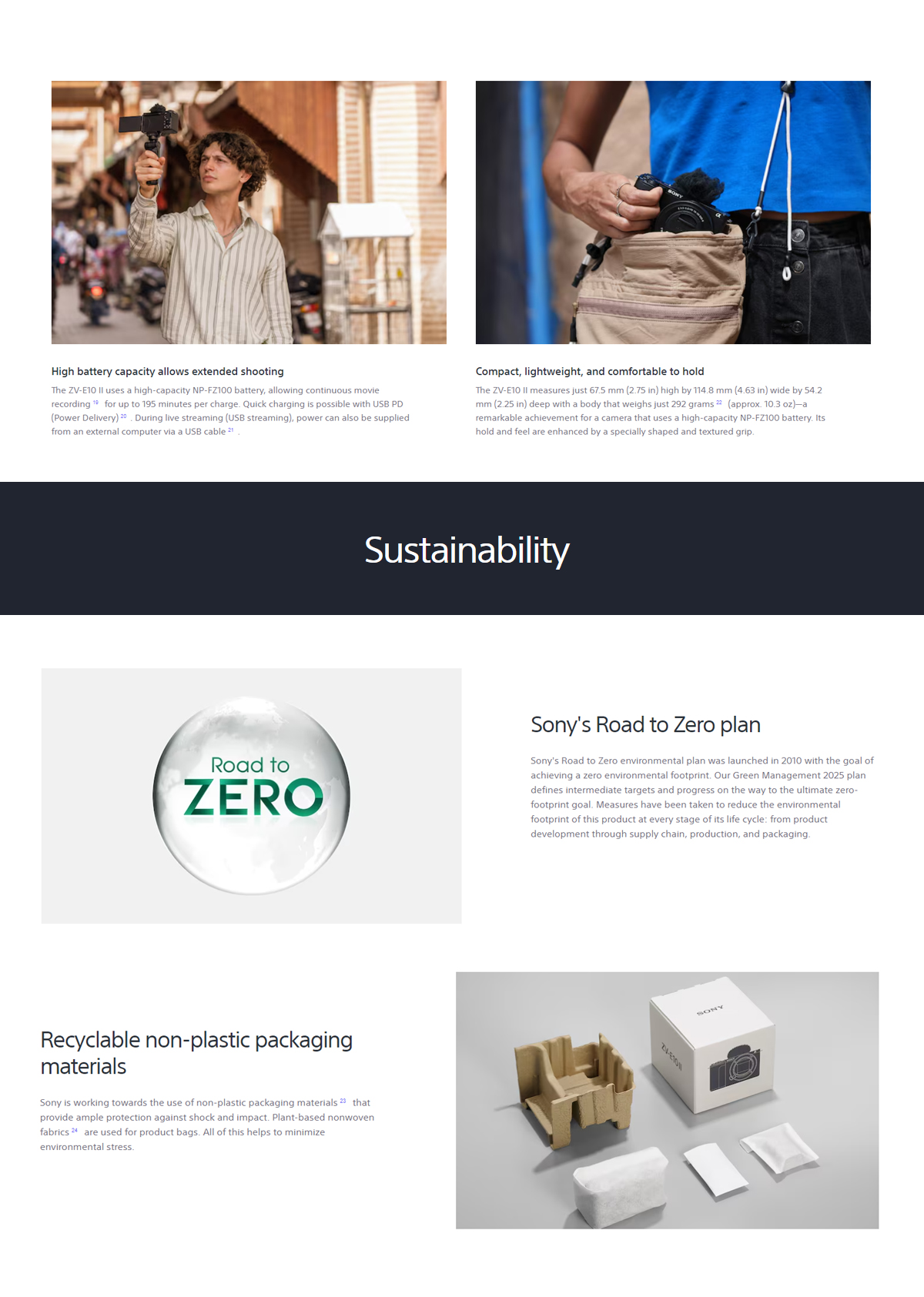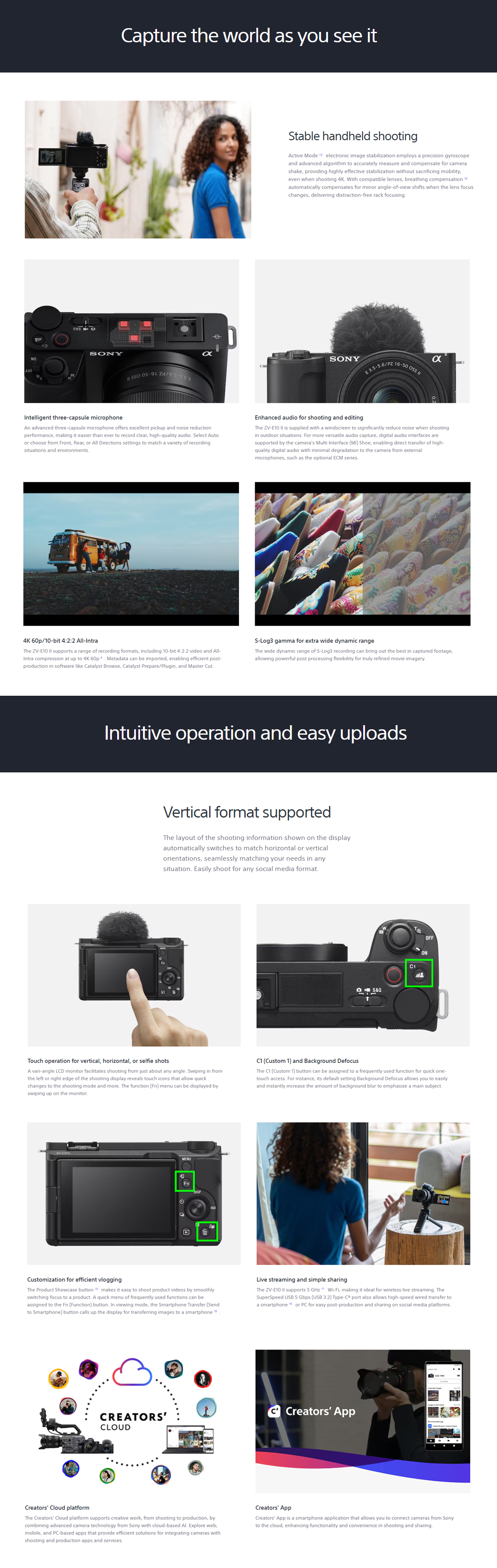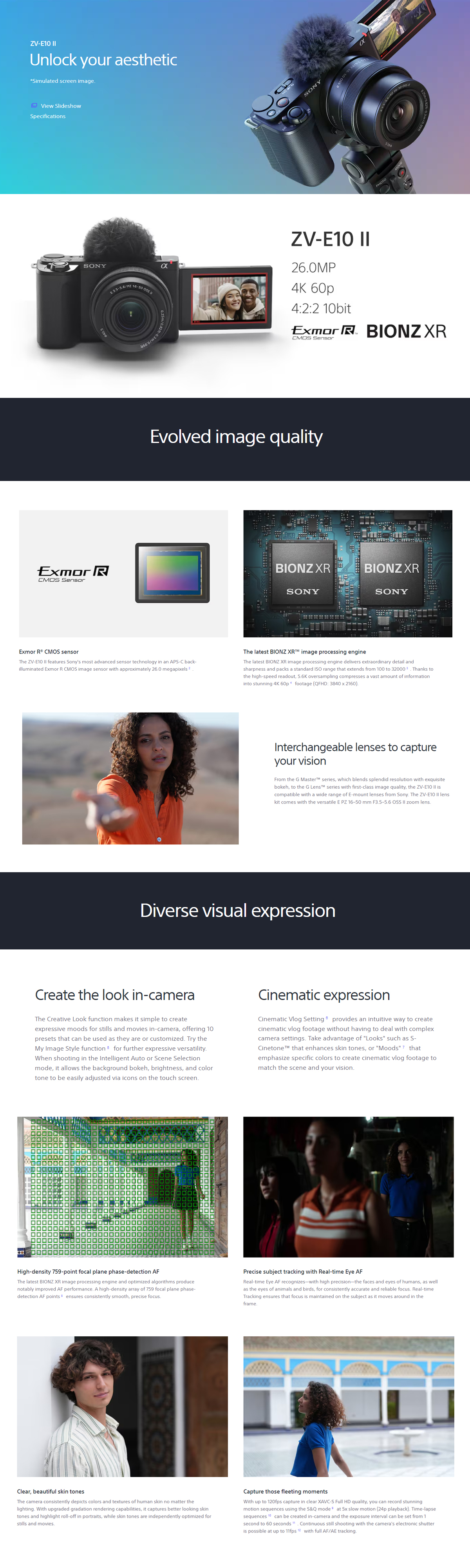 - With improved features that expand upon its content-creation-focused predecessor, the Sony ZV-E10 II is outfitted with a 26MP APS-C sensor for faster performance and high-quality imagery in a compact form factor designed for vloggers. This aligns the ZV-E10 II with tried and true models such as the FX30 and the a6700. Built-in creative shooting modes, a 3-capsule directional microphone, and a 3" articulating LCD touchscreen with vertical orientation support and integrated tally light make for a powerful multi-purpose vlogging device. Other notable upgrades with the ZV-E10 II include a 759-point phase detection autofocus system, Cinematic Vlog mode, and compatibility with larger-capacity NP-FZ100 batteries.