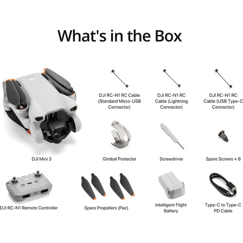• Fly longer with improved social media support when filming with the Mini 3 Drone from DJI. Compared to the previous generation, the Mini 3 sports improved wind resistance and battery life, now offering up to 38 minutes of flight time. It also adds true vertical shooting, which is a feature that lets you rotate the gimbal 90° to film vertical shots that can be immediately shared on social media platforms. Like the Mini 2, the Mini 3 captures stunning videos in 4K HDR, uses OcuSync 2.0 for a transmission range of up to 6.2 miles, and includes a host of automated functions to make piloting easier. This version of the Mini 3 gets you in the air quickly, with the inclusion of an RC-N1 remote, flight battery, and more.