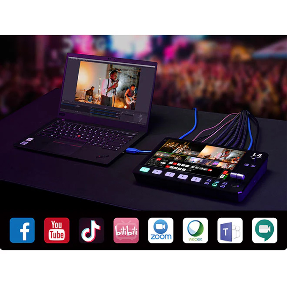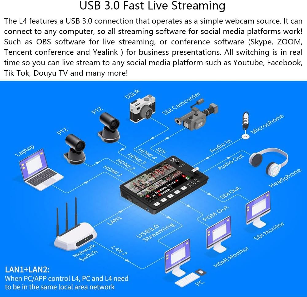 L4 is for video creators or anyone who wants to make broadcast quality multi-camera programs simply and quickly from anywhere. You can live streaming to YouTube/Facebook/Instagram or using Skype or ZOOM for innovative business presentations.Best of all, L4 is plug and play, you don’t need to be a video professional to achieve great looking results.
