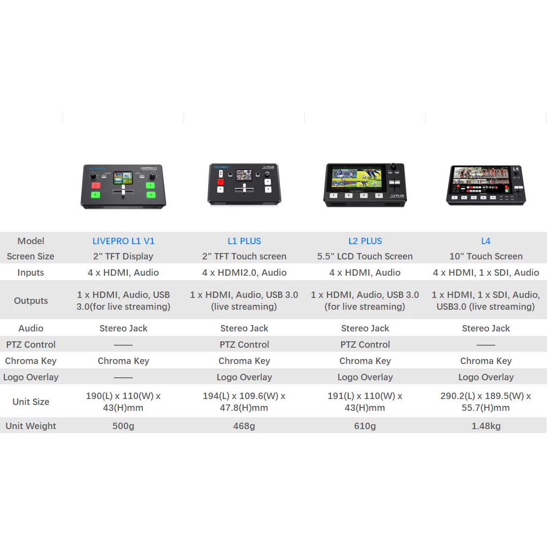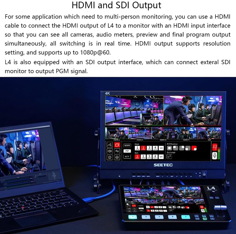 1. Multi-cam connecting: L4 with 4 HDMI and 1 SDI,ideal for medium or large multi-cam live streaming.For medium live streaming, you can use 2 to 3 cameras,capture a close-up or panorama of different view, you can also connect PC to play PPT; for large live streaming, you can use 3 to 5 cameras,can also connect PC to play PPT or connect PTZ controller.All of pictures can be quickly switching via T-bar and buttons.