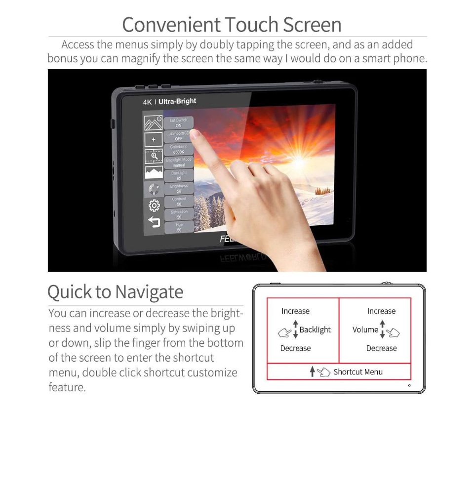 • Featuring a 323 PPI (pixels-per-inch) IPS LCD panel, the LUT7 7" 4K HDMI Monitor from Feelworld displays SD, HD, UHD, and DCI 4K video. The LCD panel boasts a 1920 x 1200 resolution, 16:10 aspect ratio, 1200:1 contrast ratio, and a 2200 cd/m² measured brightness for easy viewing outdoors as well as indoors. The touchscreen allows you to quickly access your settings, and the IPS LCD provides good off-axis viewing, allowing you to see the image without being directly in front of the monitor and not experiencing distorted colors or contrast. The monitor's chassis is both thin and light at about an inch thick and weighing only 1 lb.