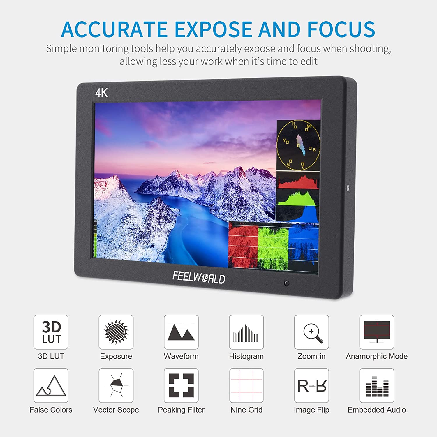 • Upgrade your on-camera viewing experience while shooting in the field to a Full HD monitor with the lightweight FeelWorld T7 Plus, a lightweight 7" IPS monitor outfitted with simultaneous vectorscope, histogram, and both audio phase and level monitoring. The T7 Plus supports 4K HDMI in and out, and it uses Rec. 709 color standard with color calibration for accurate color reproduction and vivid image viewing. The 1/4"-20 threads on the top and bottom of the monitor allow you to mount it on the included mini hot shoe mount adapter and secure it to the top of your camera.