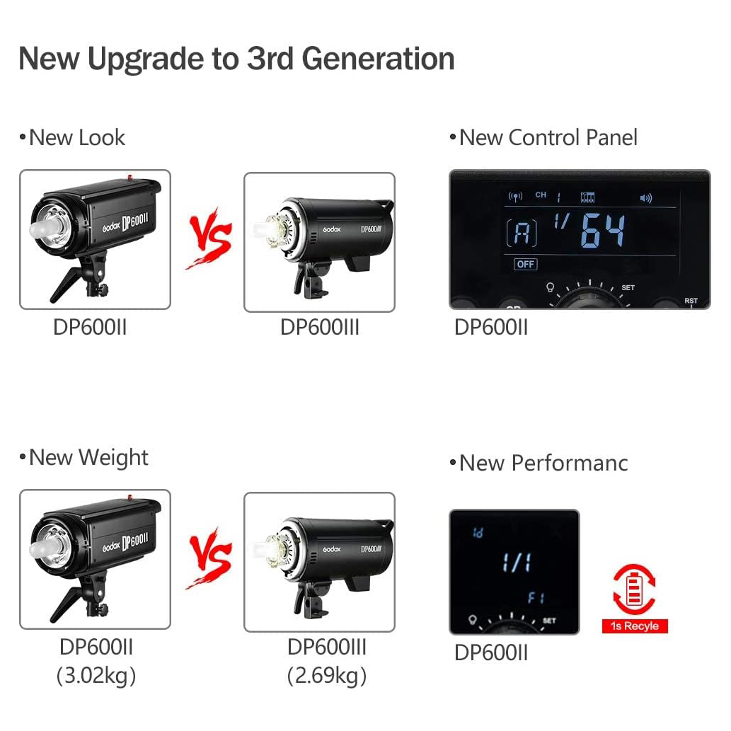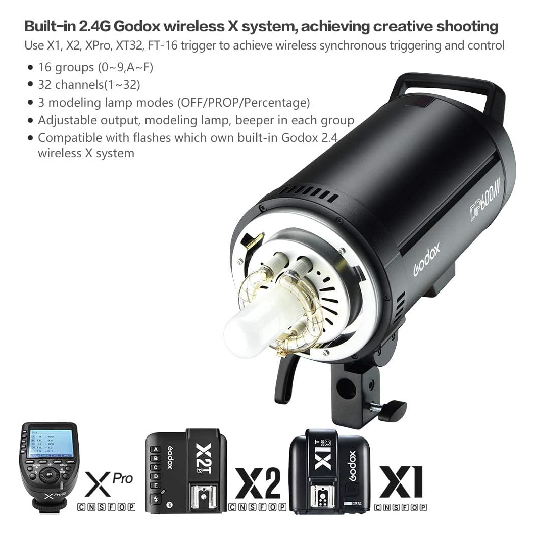 - An advanced version of its predecessor, the DP600III Flash Head from Godox is a full-featured 600Ws monolight with several professional and convenience features. The head has a color temperature of 5600K, a recycle time to full power of 1.0 sec, and flash durations from 1/800 to an action-stopping 1/2000 sec. Power is variable from 1/64 to full power, while the DP600III's 150W modeling can be set to a percentage or proportional to the flash power to allow you to accurately preview your final shot. All of these functions can not only be made manually on the unit, but also wirelessly via the head's built-in Wireless X System receiver.