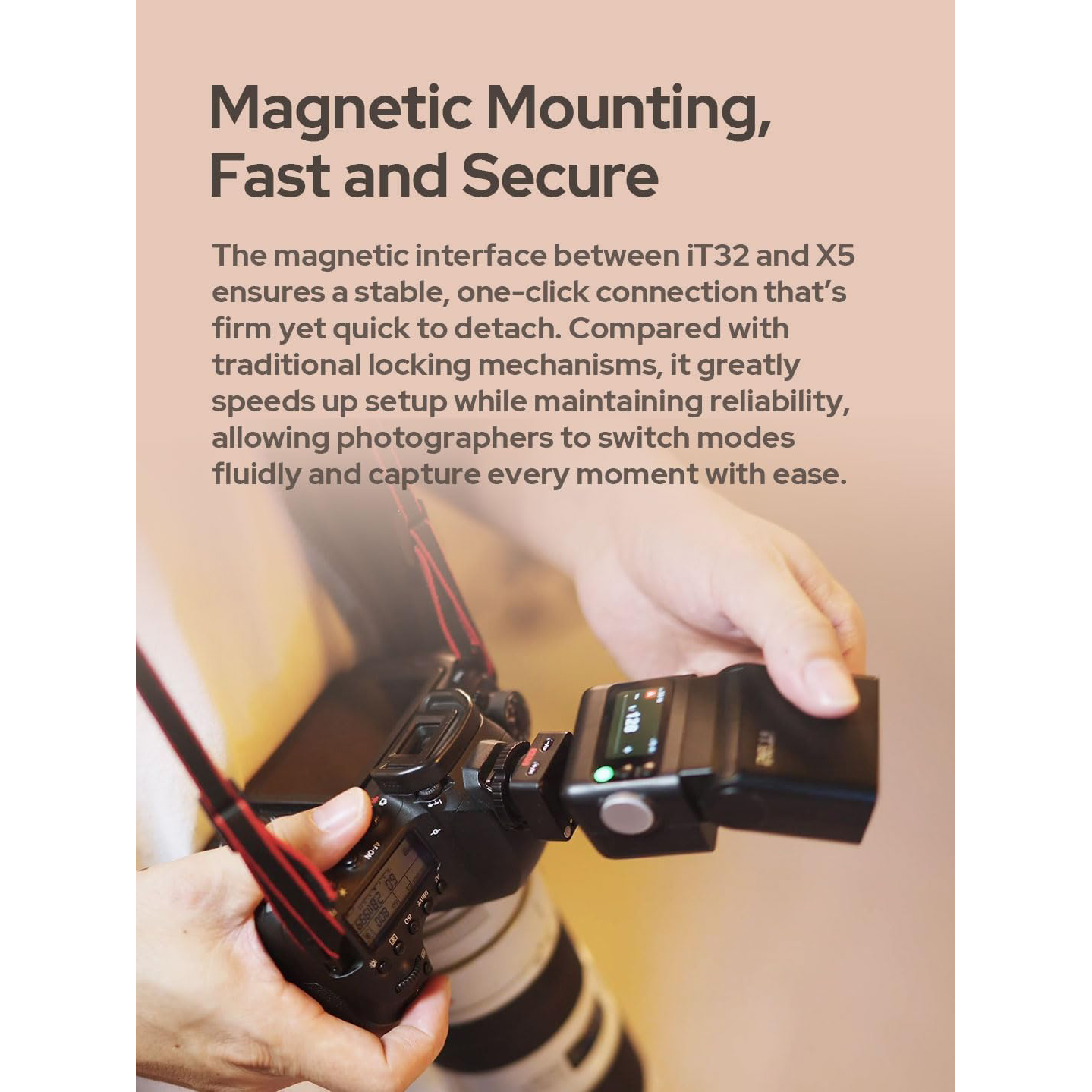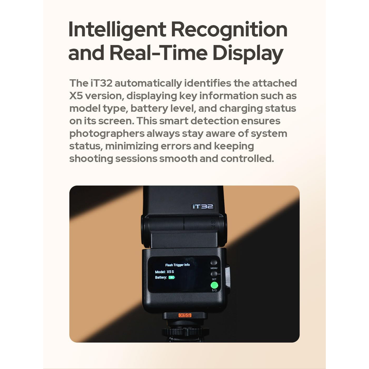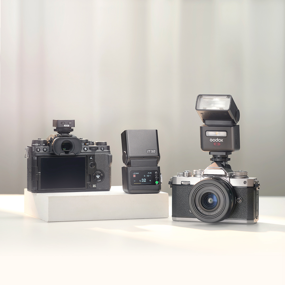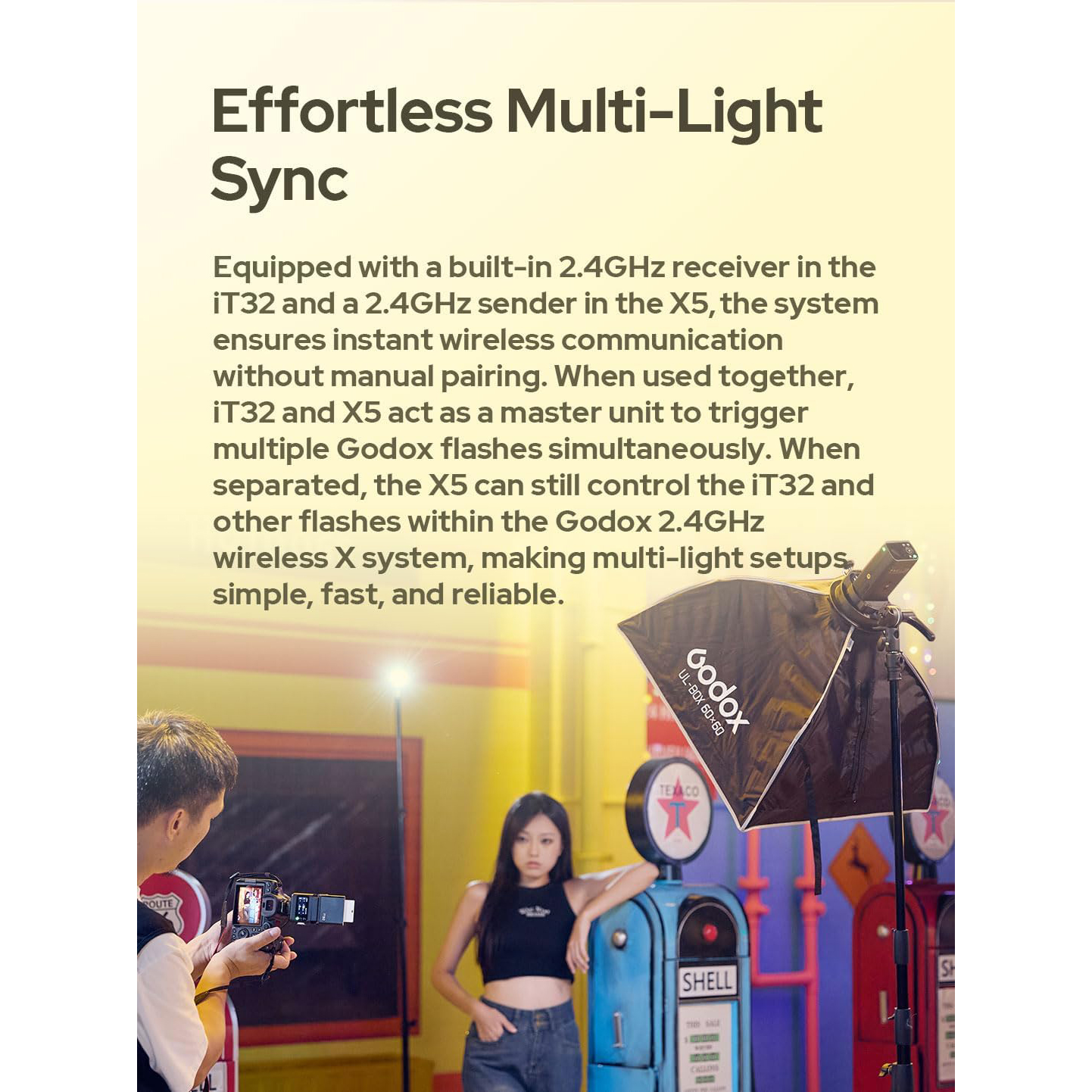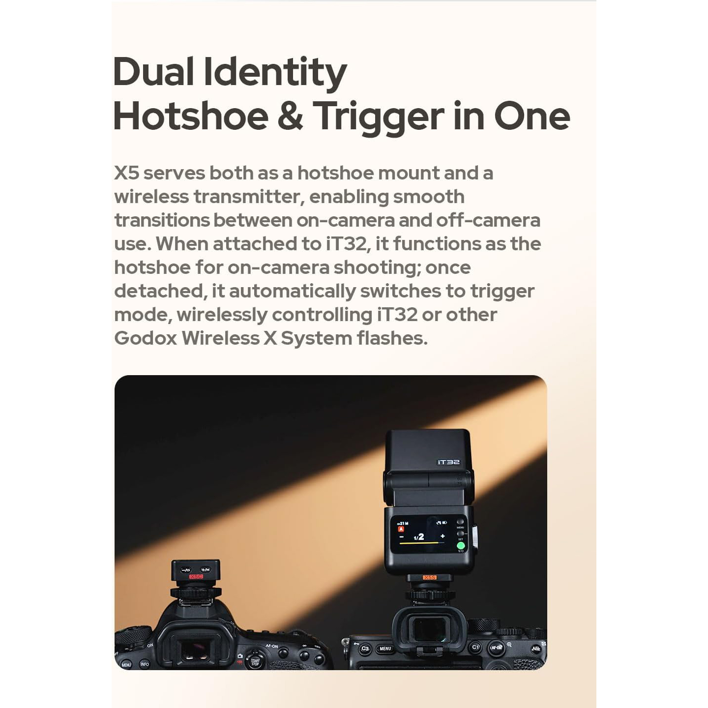 - The dynamic X5 TTL Wireless Flash Trigger from Godox works seamlessly with the brand's separately available Godox iT32 mini flash by adding a hot shoe connection and flash triggering capability. This version, the X5, features a hot shoe compatible with select cameras. By simply aligning the X5 with the bottom of your iT32, the flash will automatically absorb it for easy attachment. After this step, rotate the locking ring of the flash trigger to properly insert the X5 into the hot shoe mount of your compatible camera. To complete, rotate the locking ring until it's locked for secure connection.