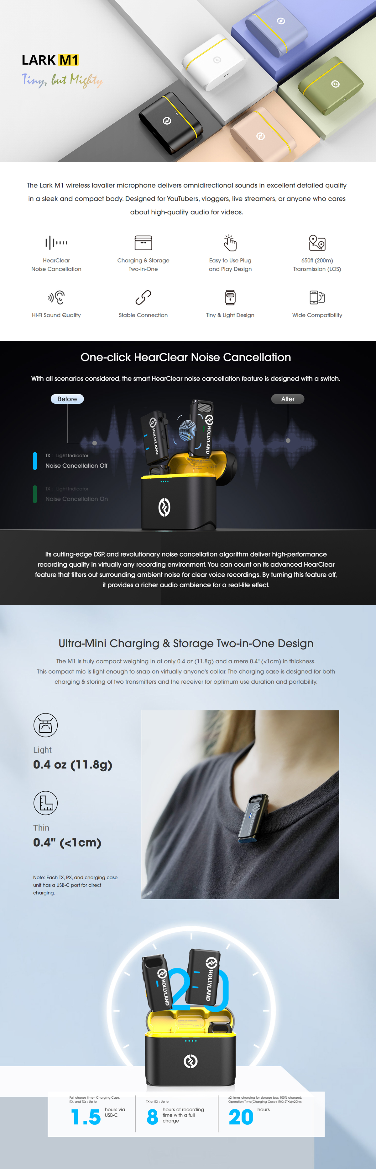 - Record up to two people in mobile journalism or content creation applications using this black, 2.4 GHz LARK M1 DUO Wireless Microphone System from Hollyland. The system includes two transmitters with built-in, omnidirectional microphones, a dual-channel receiver, and a changing case—all with a compact form factor. Clips on the back of each transmitter allow you to attach them to the lapel of a shirt. With a TRS to TRS and TRS to TRRS adapter cables, the receiver can be plugged into compatible cameras or smartphones.