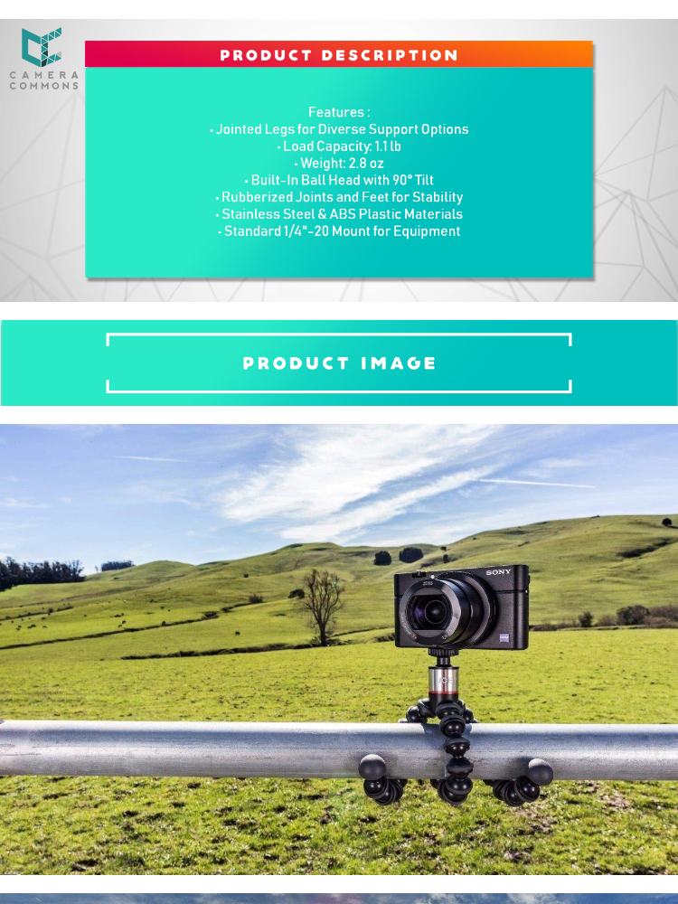 - Can be used with point-and-shoot cameras, portable lights, and any other gear weighing up to 1.1 lb