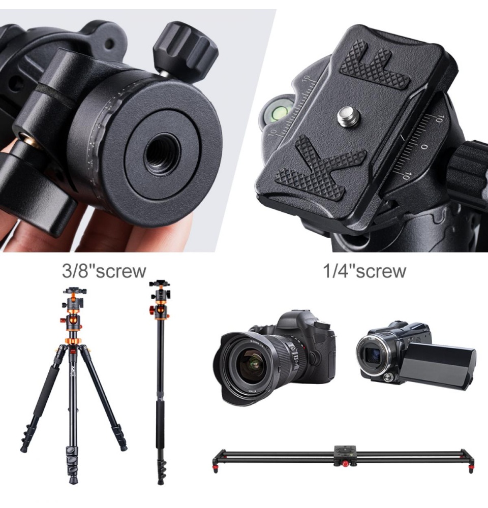 - 1/4 inch quick shoe plate is suitable for DSLR cameras and camcorders,3/8 inch screw thread hole is for connecting tripod, monopod, slider and other stands.