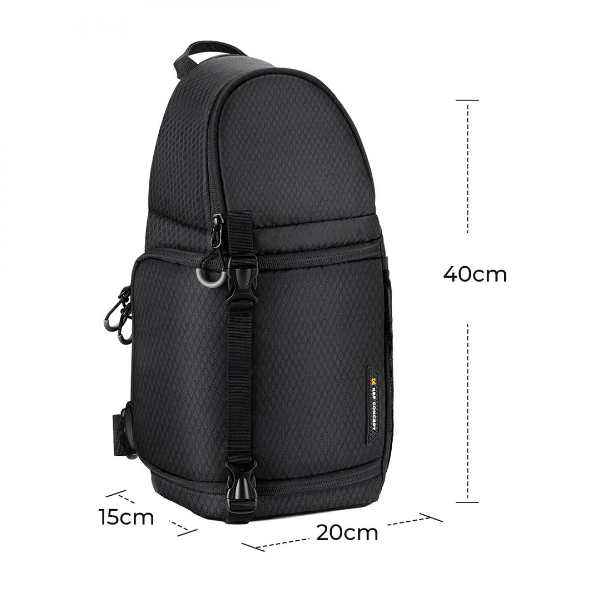 - The black Beta Series Camera Sling Bag from K&F Concept holds a camera body and two lenses, as well as extra gear and accessories. The interior has adjustable dividers to accommodate your gear. You can quickly access your gear through the rear and side. The waterproof exterior helps keep your gear dry and safe in wet or inclement conditions. A thick, wide cross-body strap makes carrying this pack easy and comfortable.