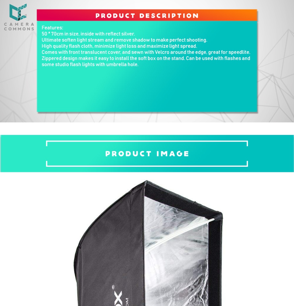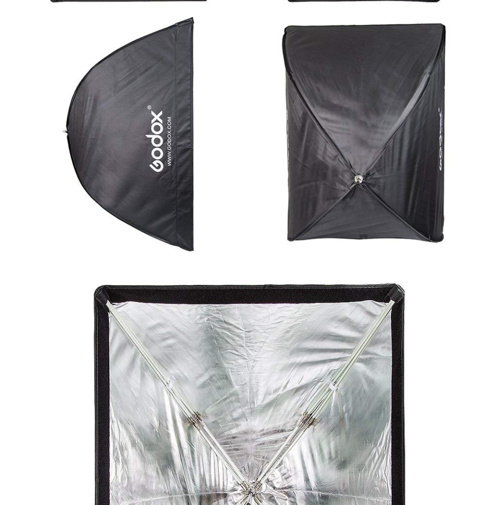• A softbox is an enclosure around a bulb comprising reflective side and back walls and a diffusing material at the front of the light. A soft box can be used with either flash or continuous light sources such as flourescent lamps or "hot lights" such as quartz halogen bulbs or tungsten bulbs. If soft box lights are used with 'hot' light sources, the user must be sure the softbox is heat rated for the wattage of the light it is attached to in order to avoid fire hazard. The softbox offers soft accurate, even, bright , smooth lights you need for shooting a perfect image. Skin tone come to be much alive and blemishes fade away. Colors pop and your shots can go to new levels or professionalism with a good softbox. Easy to disassemble, easy to fold, and easy to carry, ideal for studio or outdoor mobile photography. The soft box is black outside and silver inside with even coating, high reflection.