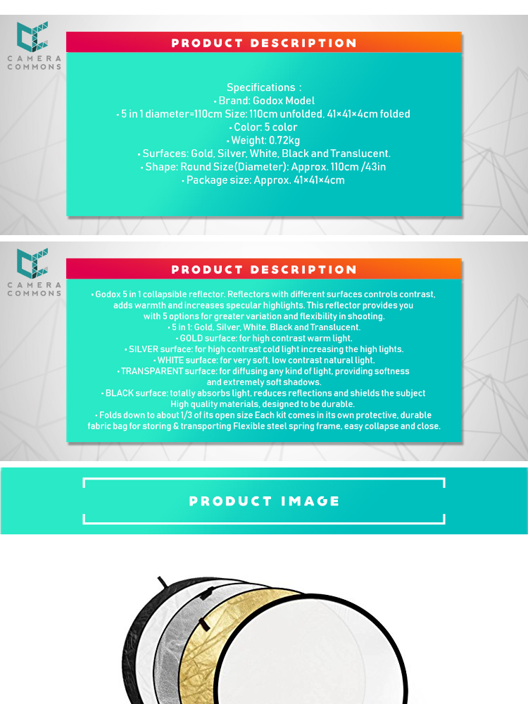 - Godox 5 in 1 collapsible reflector. Reflectors with different surfaces controls contrast, adds warmth and increases specular highlights. This reflector provides you with 5 options for greater variation and flexibility in shooting.