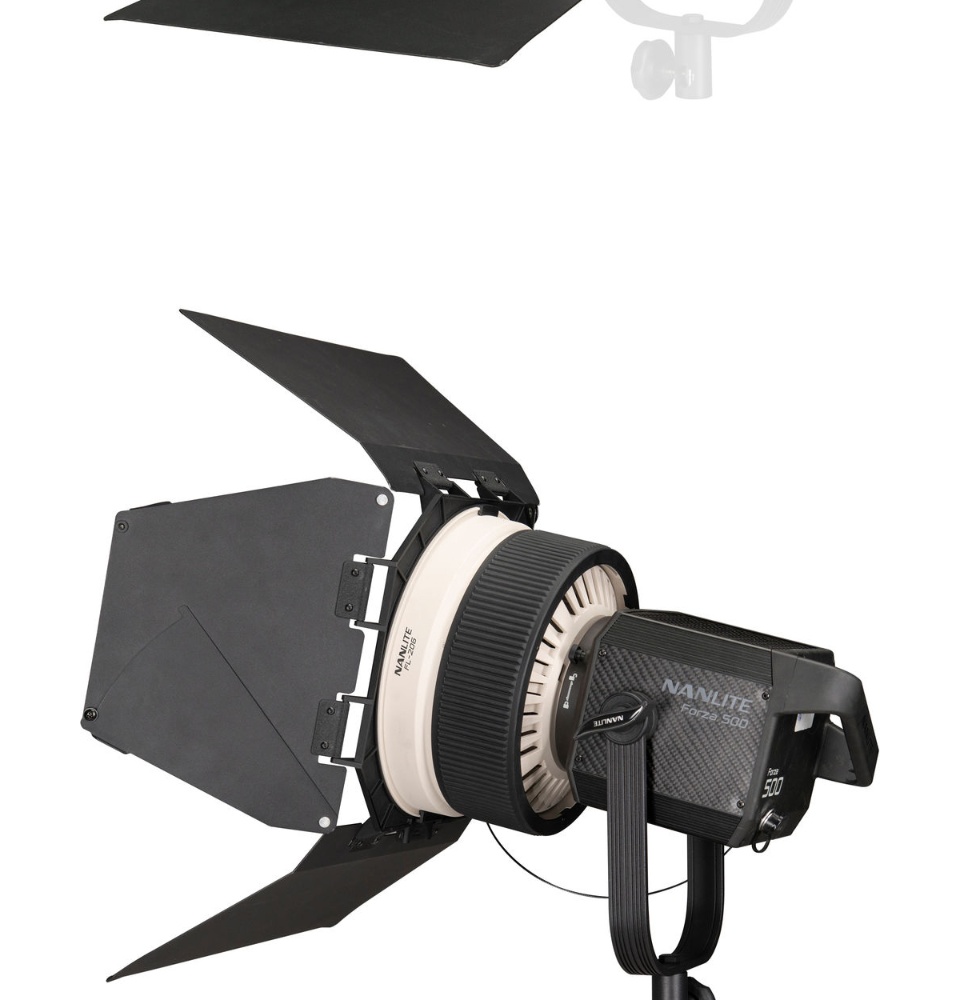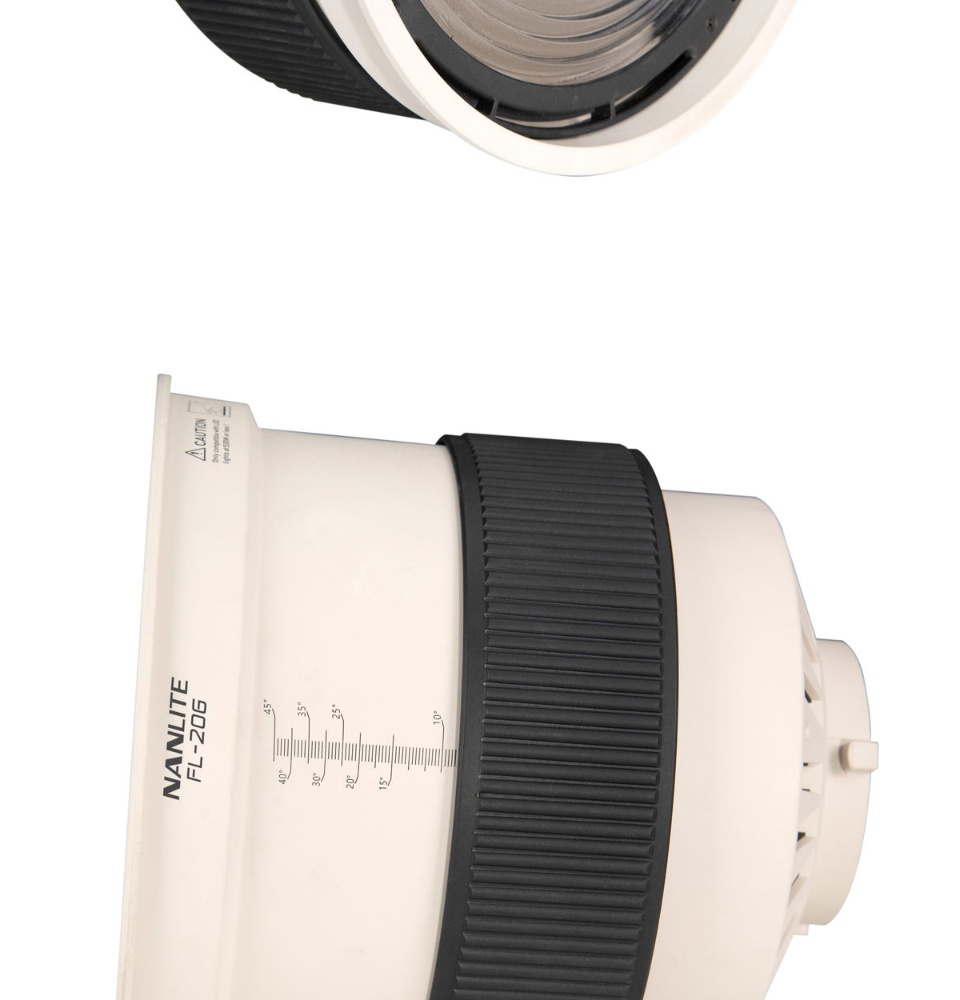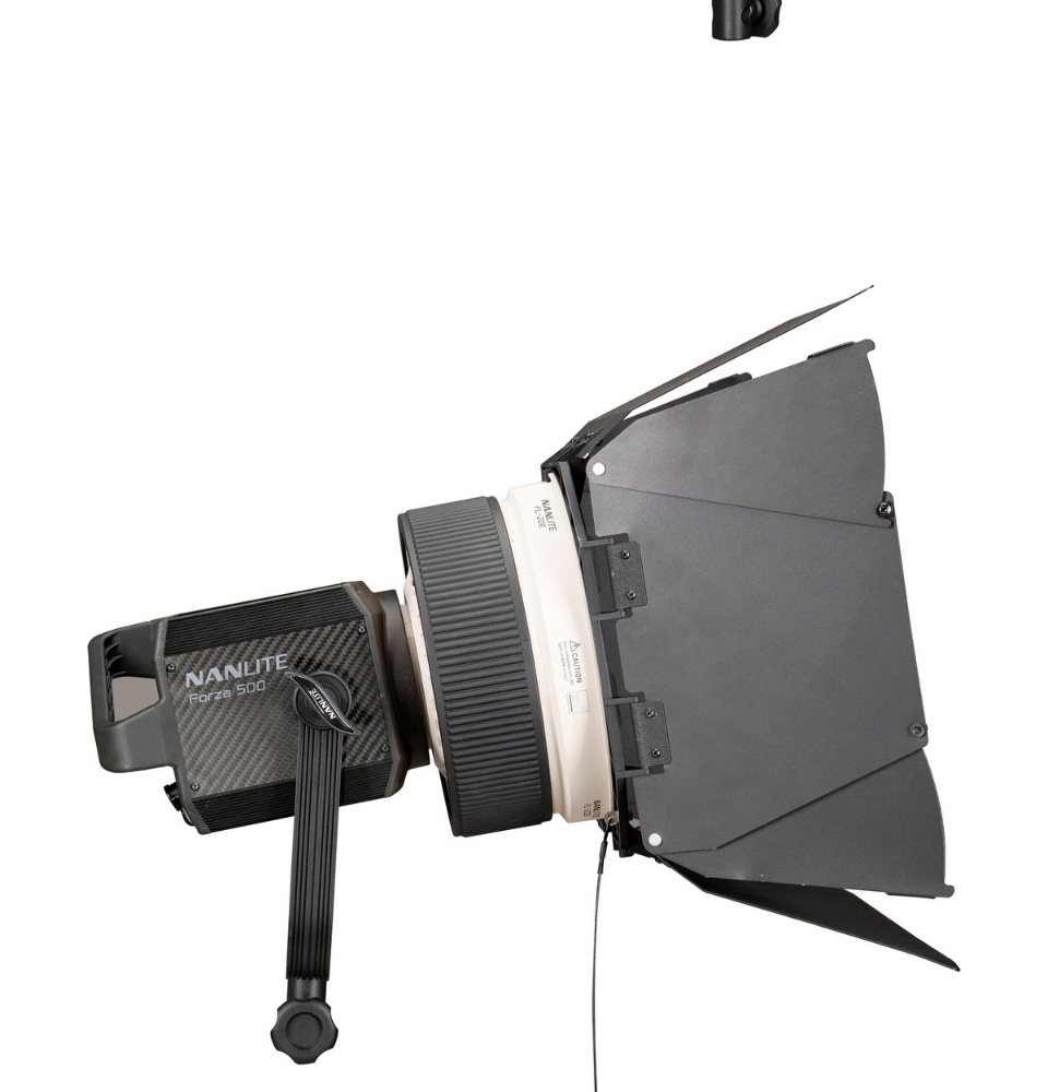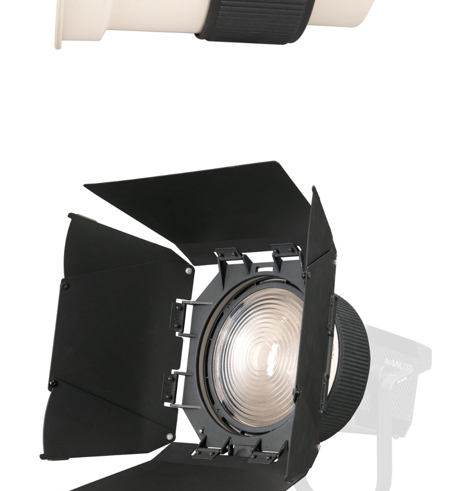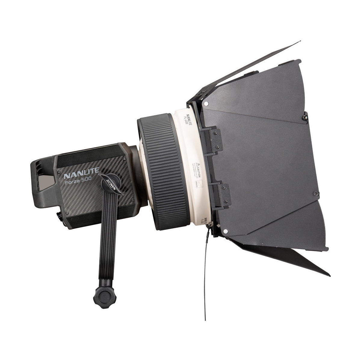 Nanlite FL-20 Fresnel Lens for Forza 300. A glass fresnel lens with an adjustable-length housing that focuses light output. Enables beam angle adjustment from spot (10°) to flood (45°). Includes metal barndoors and a Bowens S-Type Mount.