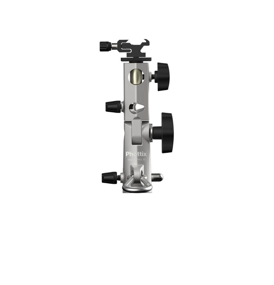 • The patented Phottix Varos Pro M Umbrella Holder was designed by professional photographers to mount a hot shoe flash and umbrella to a light stand or tripod. Perfect on location or in the studio, umbrellas provide soft light, great for portraits or special effect. The new Varos Pro is 300% stronger than previous versions and features Aluminum alloy body with a metal coldshoe, 3/8”and 1/4”female threaded insert, male 3/8” and 1/4”s crews included.