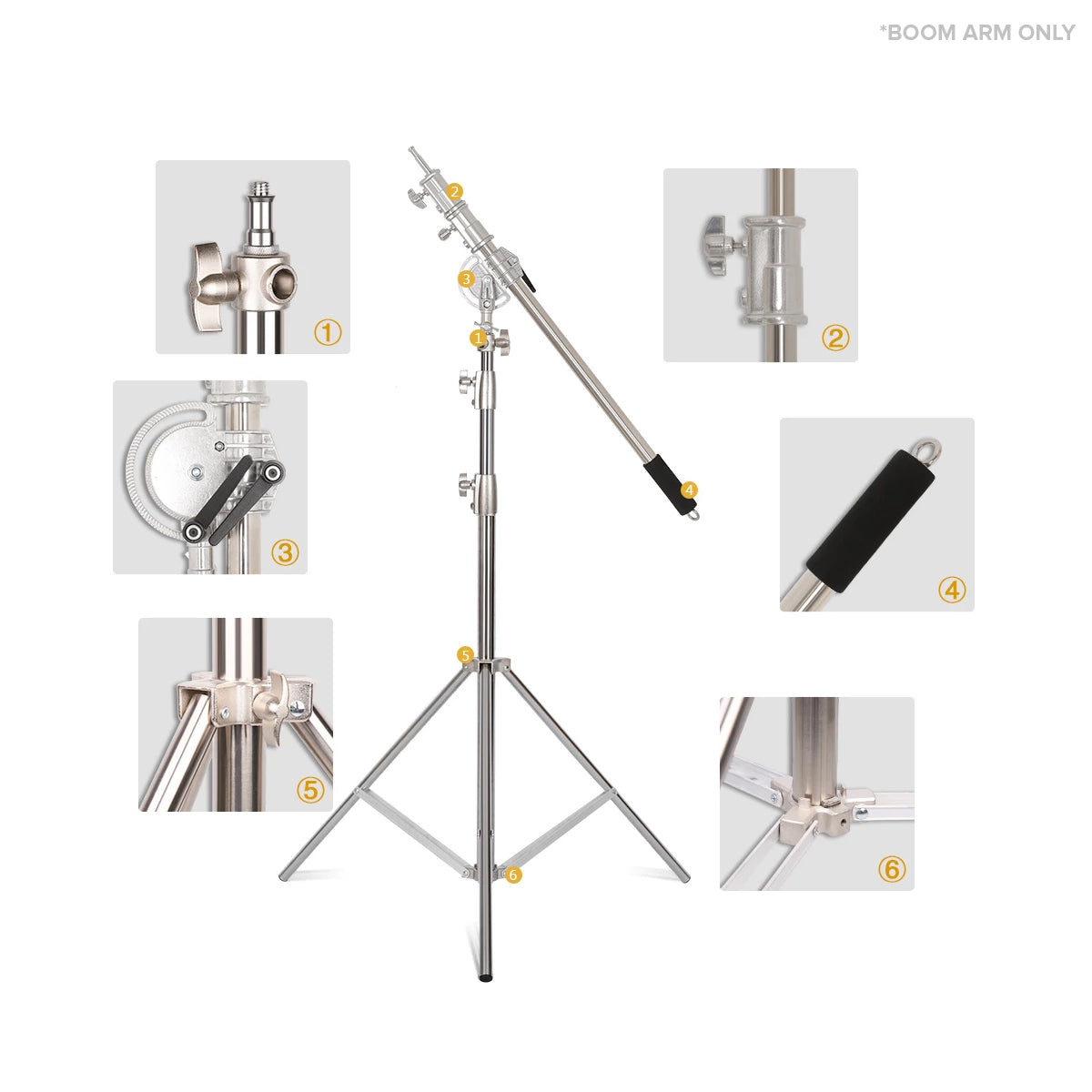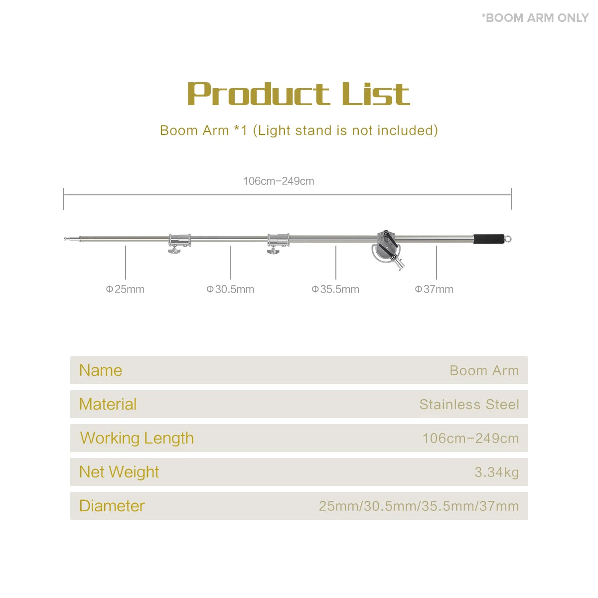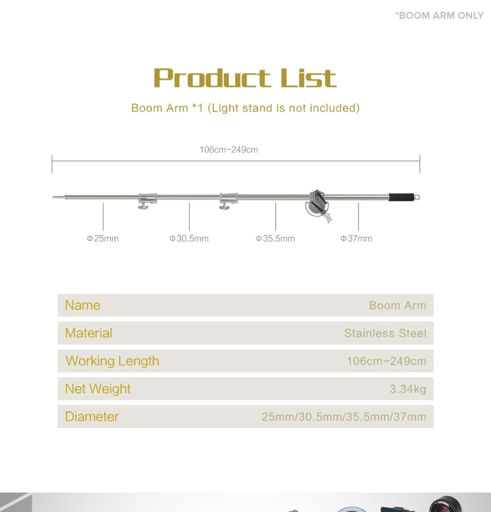 • NOTE: Light Stand is NOT INCLUDED in this package. Cross Boom Arm ONLY.