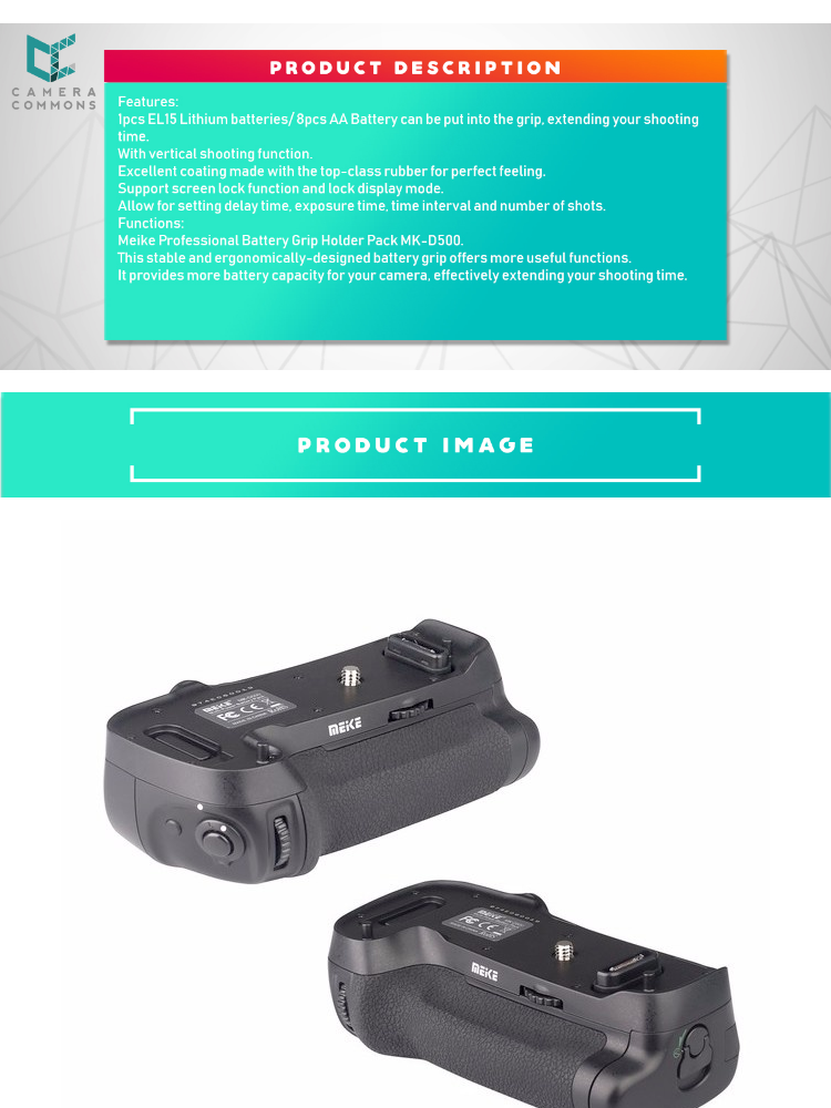 - Features: 1pcs EL15 Lithium batteries / 8pcs AA Battery can be put into the grip, extending your shooting time.