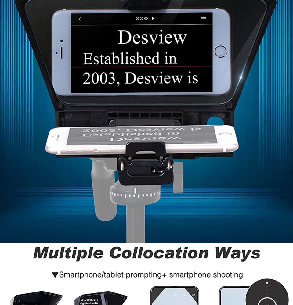 - 3. Forum/Interview shooting Teleprompter: By reflecting the manuscript displayed in the smartphonr to a specified codted one-way transparent glass 45 degree inclined before the camera,the one who is being filmed can speak refer to the manuscript.