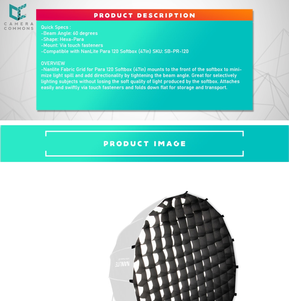 • Nanlite Fabric Grid for Para 120 Softbox (47in) Mounts to the front of the softbox to control light spill and add directionality by tightening the beam angle. Folds flat for easy storage and transport.