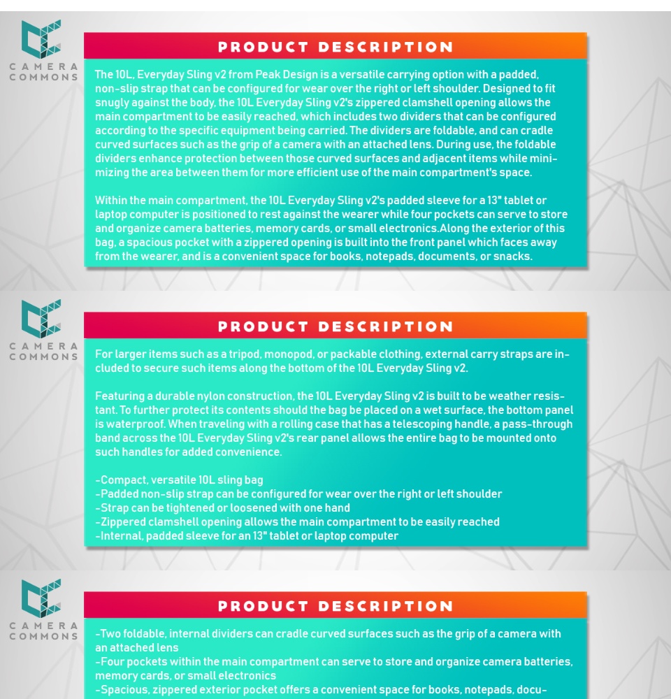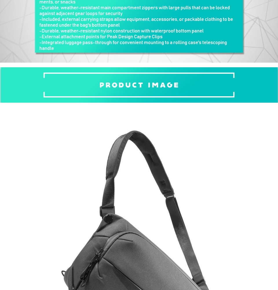 The 10L, Everyday Sling v2 from Peak Design is a versatile carrying option with a padded, nonslip strap that can be configured for wear over the right or left shoulder. Designed to fit snugly against the body, the 10L Everyday Sling v2's zippered clamshell opening allows the main compartment to be easily reached, which includes two dividers that can be configured according to the specific equipment being carried. The dividers are foldable, and can cradle curved surfaces such as the grip of a camera with an attached lens. During use, the foldable dividers enhance protection between those curved surfaces and adjacent items while minimizing the area between them for more efficient use of the main compartment's space.
