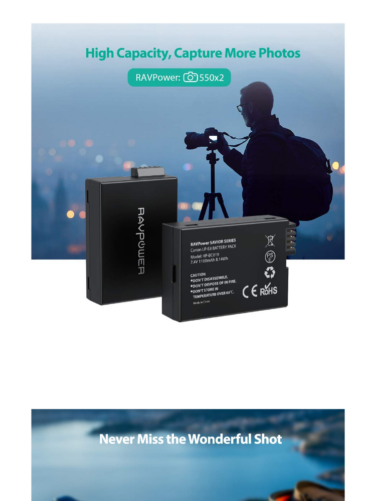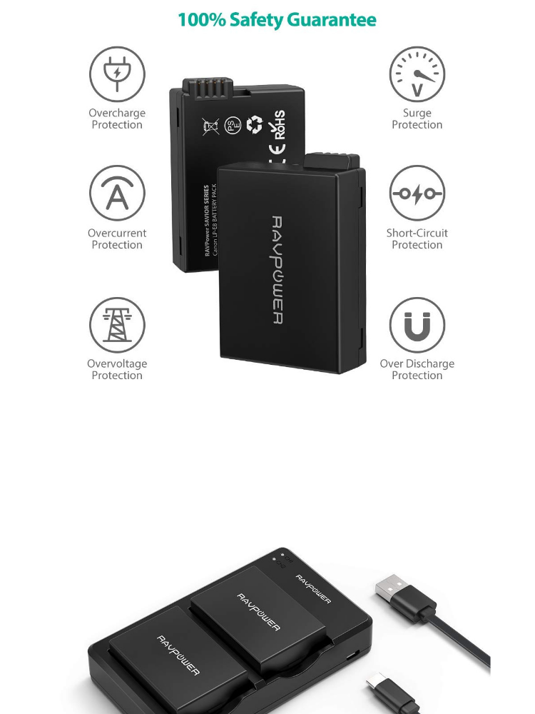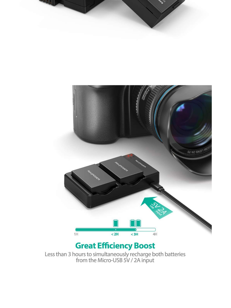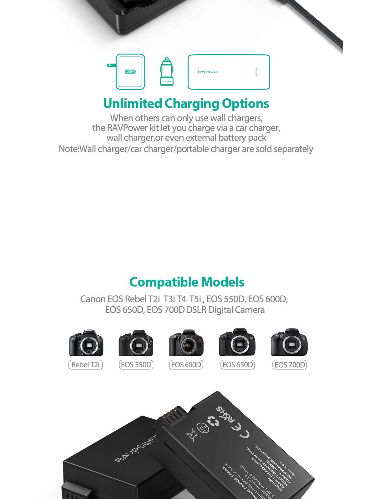 • RAVPower LP-E8 Camera Battery Charger with 2pcs Batteries Set for Canon Cameras LPE8