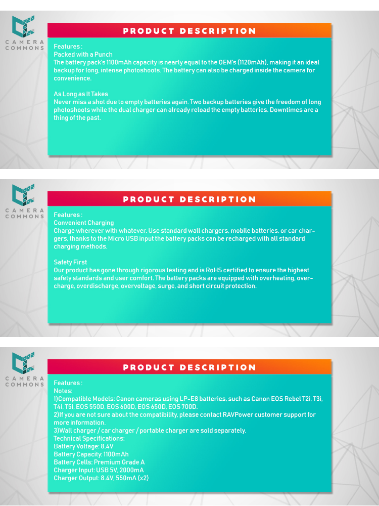 • Triple Your Runtime: With four replacement batteries and two dual charger for the empty ones, you can enjoy longer photoshoots worry-free