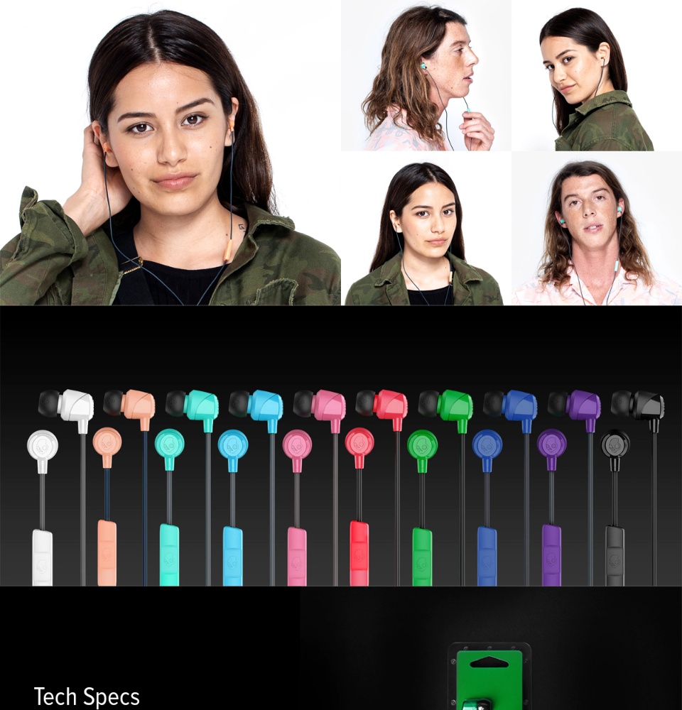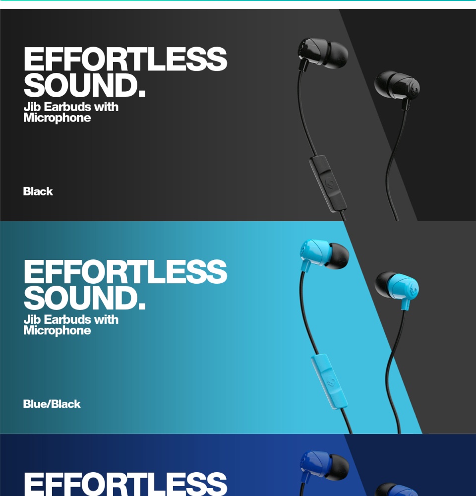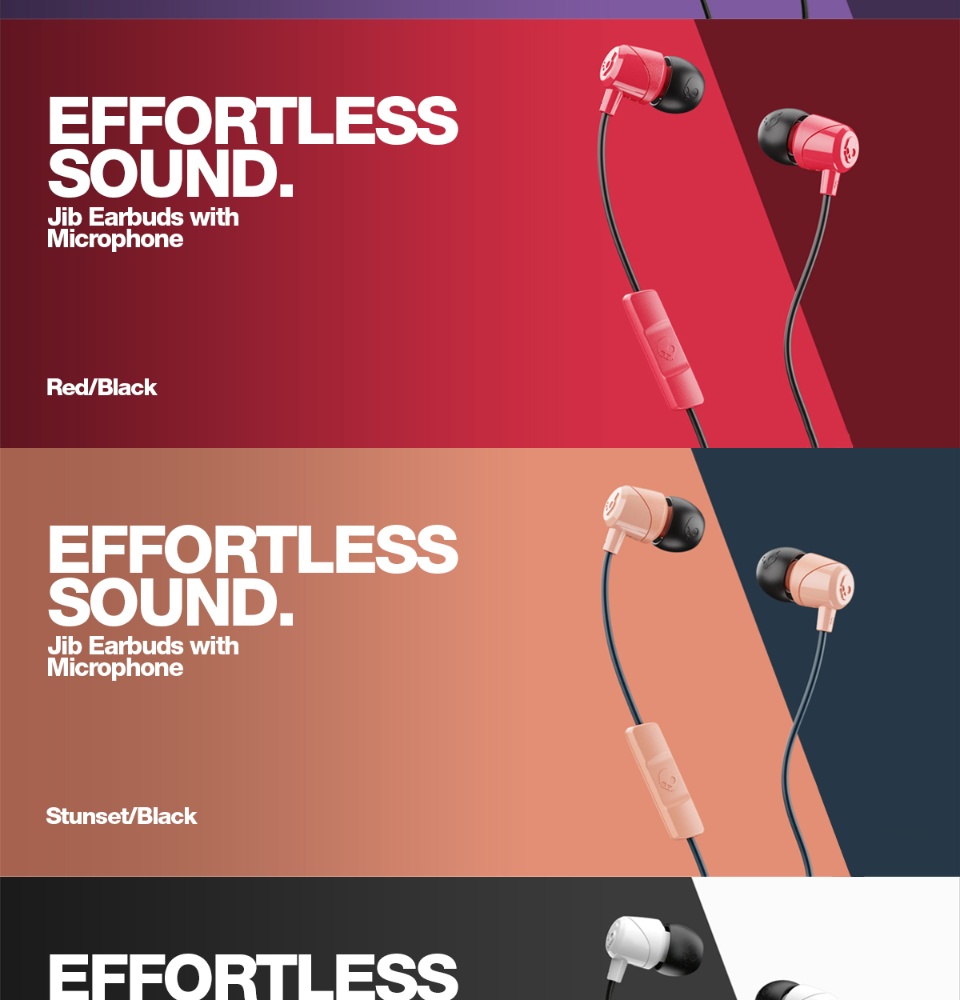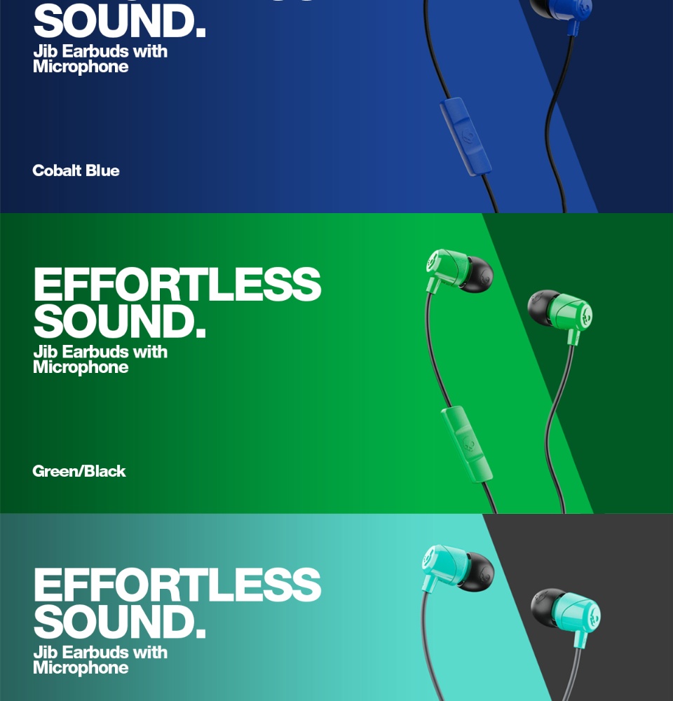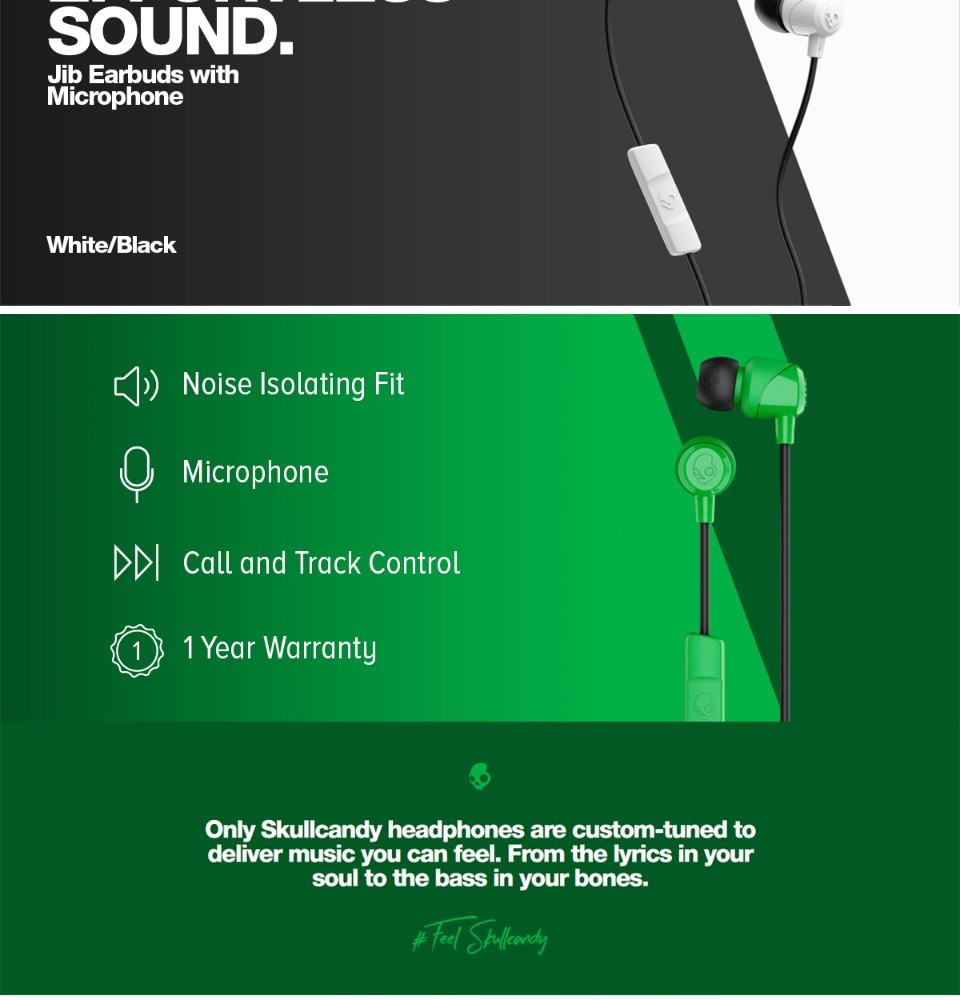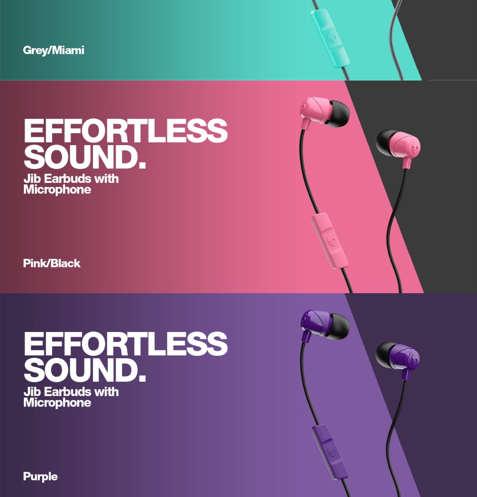 - Immerse yourself in stereo sound with these Skullcandy Jib earbuds. The inline controls let you adjust the volume as necessary, and the design helps the headphones fit securely in the ears. These Skullcandy Jib earbuds are lightweight and have enhanced bass to help you power through your most intense workouts.