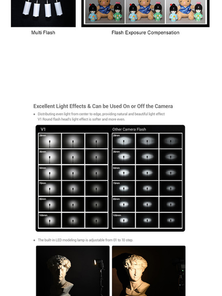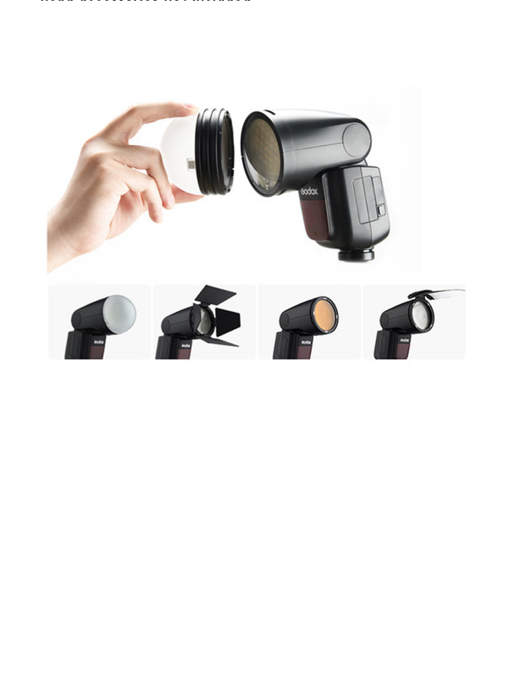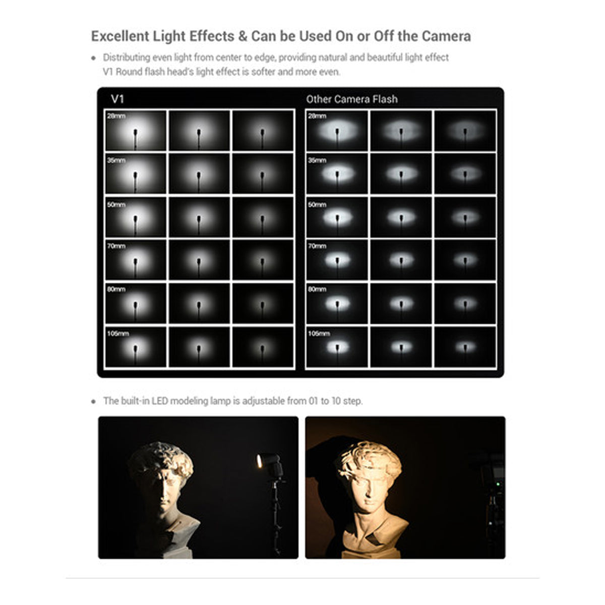 ● Adopting an innovative design, Godox introduces the V1Pro Flash – distinguished by its round head and the addition of a detachable sub-flash that improves the fill light of your scenes. The Pro version utilizes a similar compact, shoe-mounted design to the brand's original V1 flash while bringing additional features. Simply attach the included sub-flash to the front of the V1Pro to improve your portrait shots in manual or TTL mode. This powerful 76Ws unit is compatible with specific cameras with TTL automatic functionality. The V1Pro offers a zoom range from 28 to 105mm along with the ability to rotate 330° and tilt -7 to 120°. Its round head boasts uniform light quality, facilitating creative effects and distinct looks.