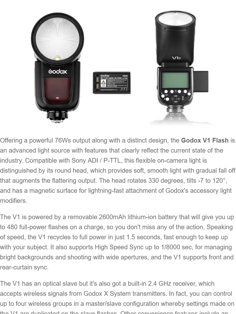 Godox V1-S V1 V1Pro Sony Flash Pro 1.5 sec Recycle Time 1/8000 HSS 480 Full Power Shots 2600mAh Lithium Battery for Sony E Cameras Round Head Flash
