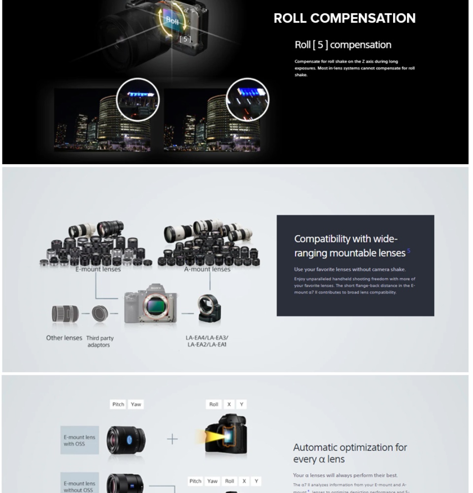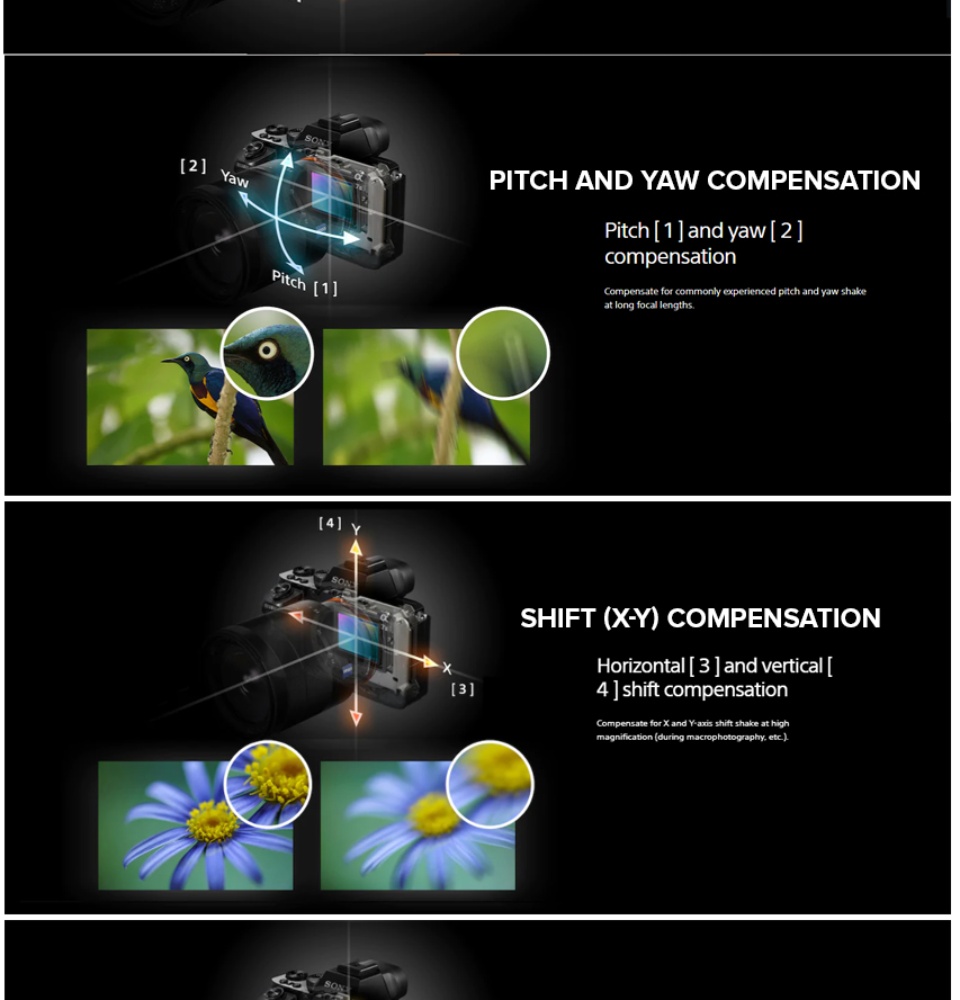 For long focal lengths, the system will correct for pitch and yaw adjustments. Macro and high magnification imagery on the other hand will benefit from the inclusion of horizontal and vertical shift compensation. And, all shooting styles will get usage out of the roll compensation. All 5 axes of stabilization will function at all times, even when used with third-party lenses and adapters or lenses with built-in optical stabilization.