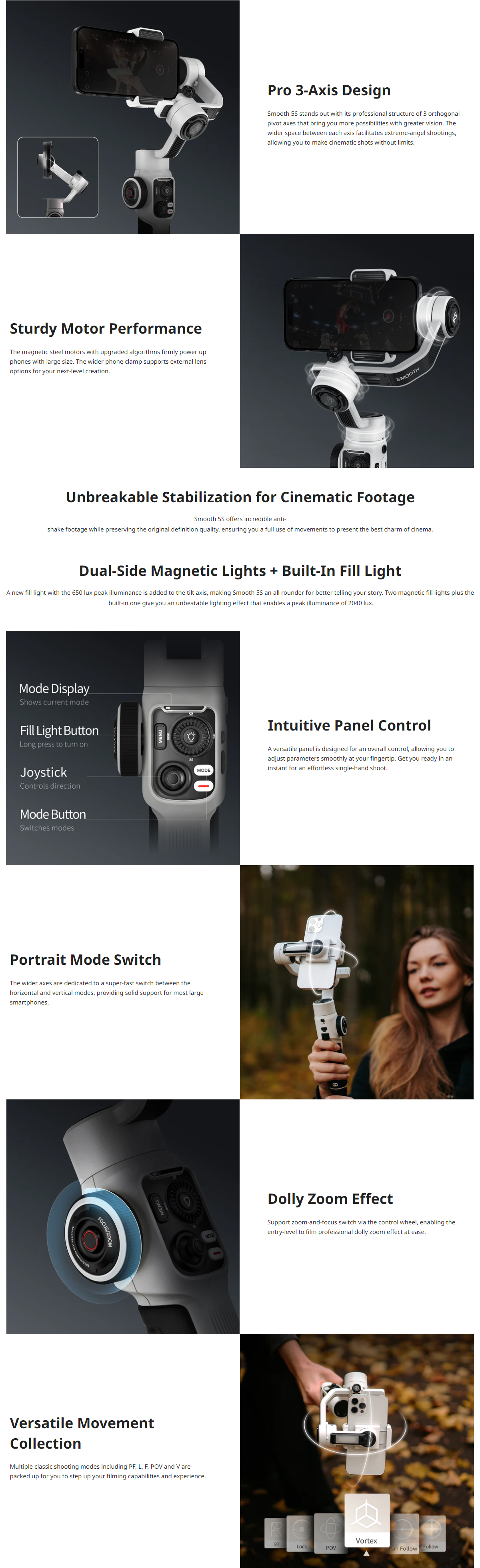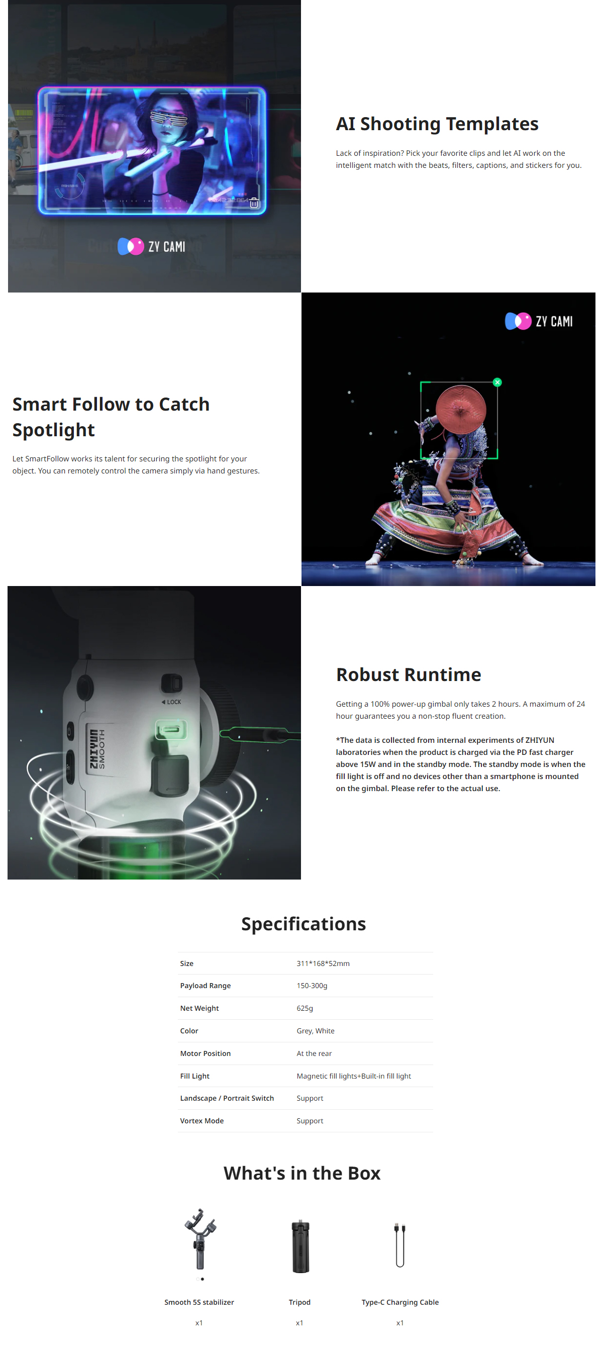 • Zhiyun Smooth 5S offers an integrated yet simplified way of filmmaking for everyone. With the classic 3-axis design, you can create inspiring content with no angle limitations. Smooth 5S makes your one-man crew.