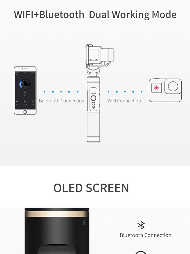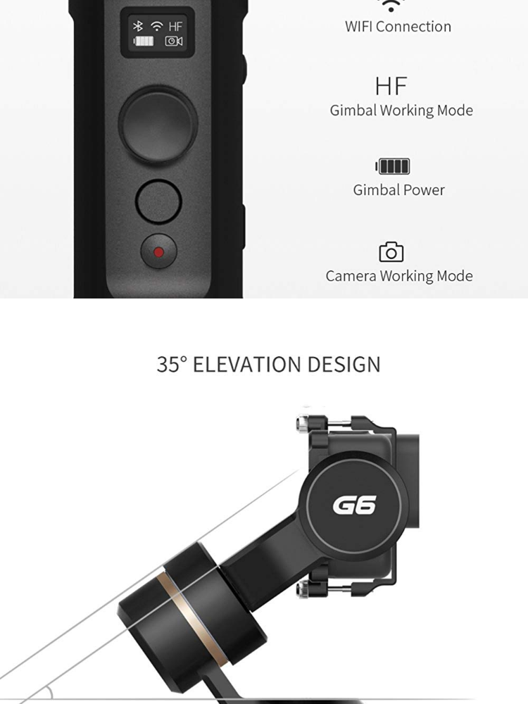 • 【WIFI+ BLUETOOTH DUAL WORKING MODE】: With Connecting GoPro HERO 6/ HERO 5/ RX0's WIFI, G6 Can Control the Camera to Take Video / Photo and Set the Working Modes. Meanwhile, All the Specifications Can Be Set in New Feiyu On App Once it Connects via Bluetooth.