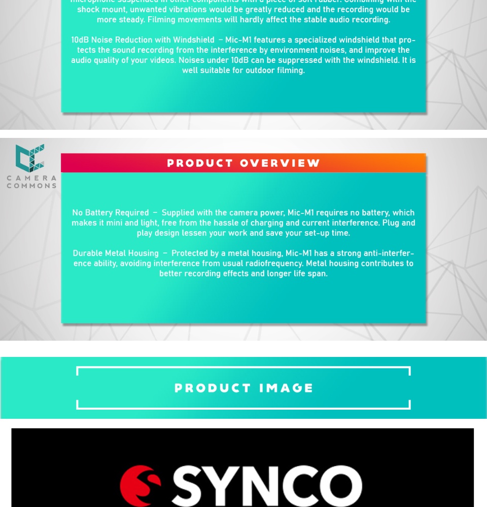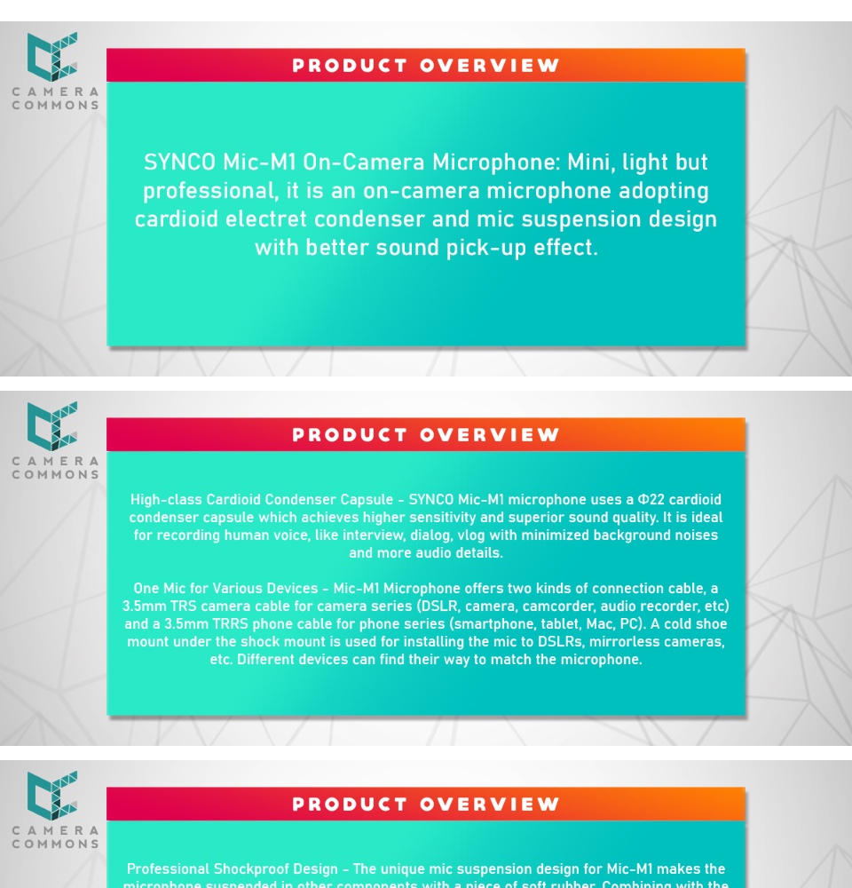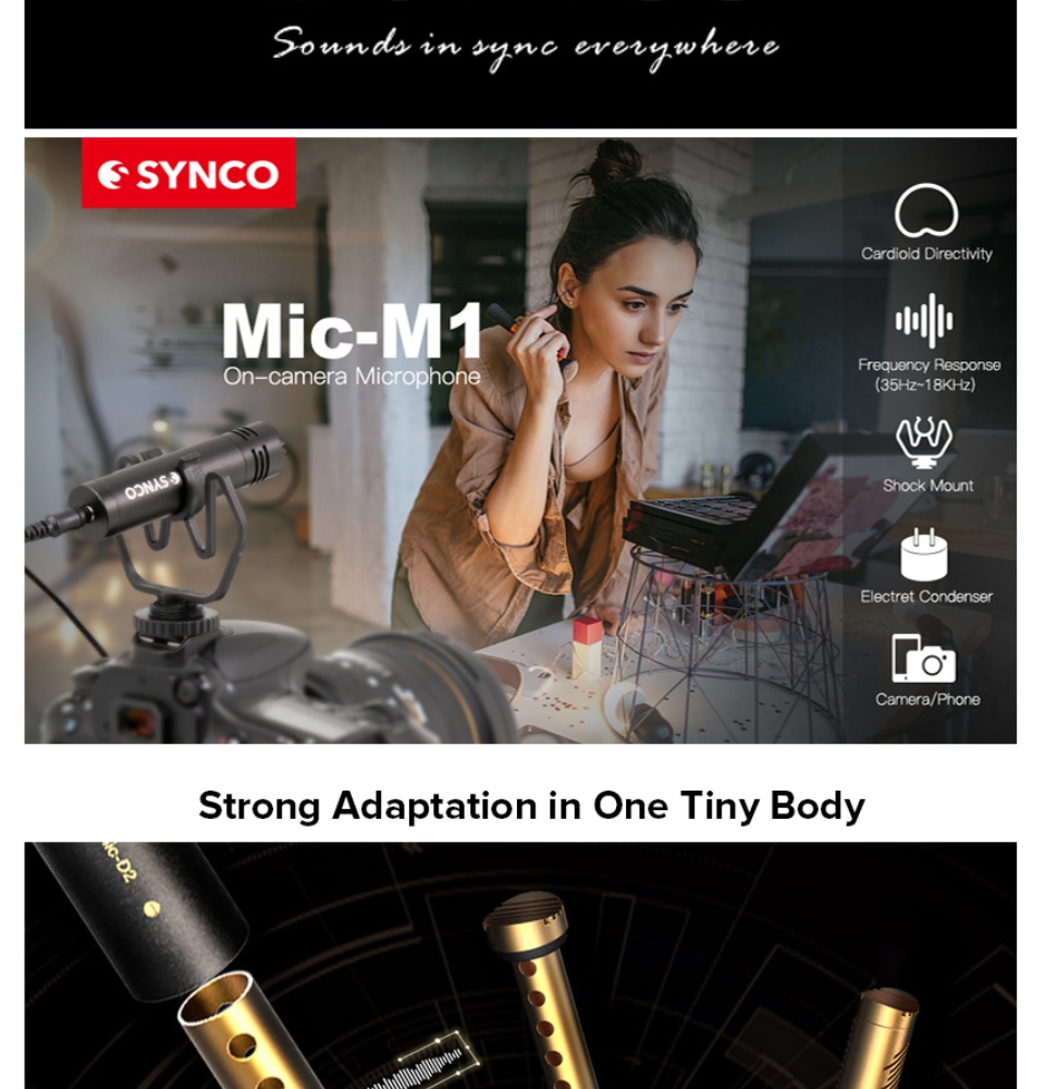 - SYNCO Mic-M1 On-Camera Microphone: Mini, light but professional, it is an on-camera microphone adopting cardioid electret condenser and mic suspension design with better sound pick-up effect.