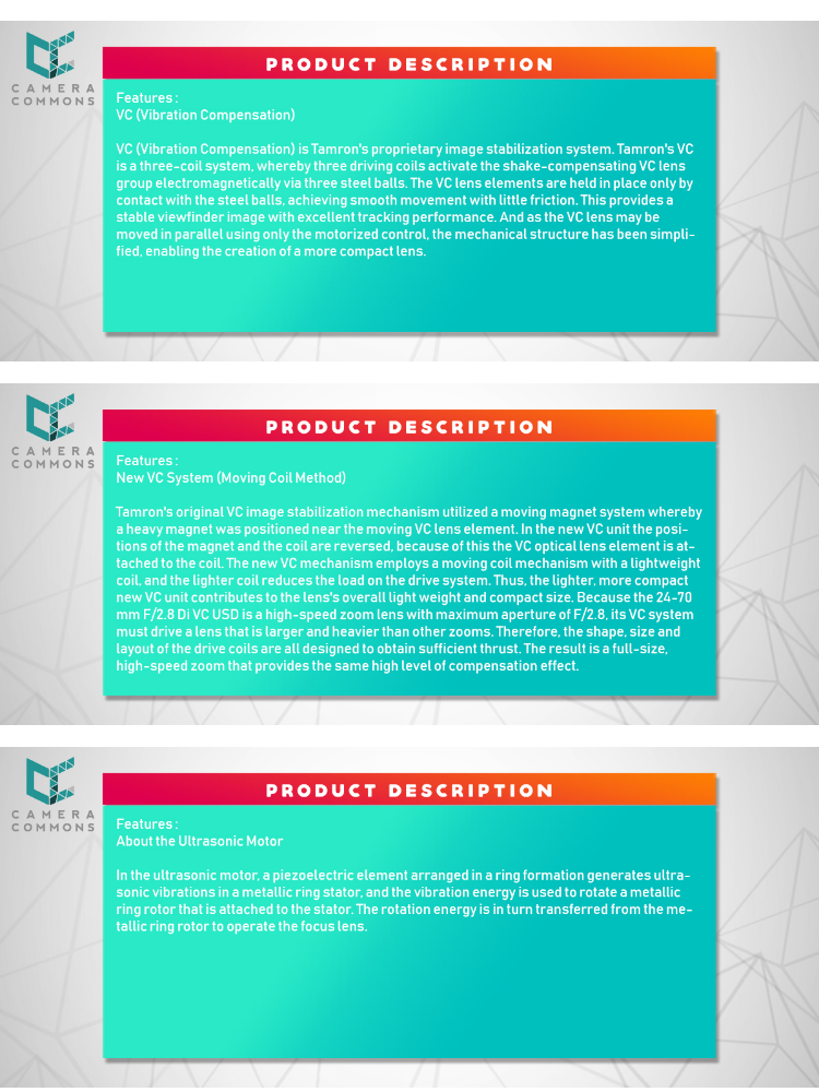 - Photographic artists have been waiting for a full-featured, constant-aperture zoom lens. The wait is over. The A007 is a high-quality, highly functional, high-speed standard zoom lens covering the 24-70mm focal range*1. It includes both Tamron's proprietary VC (Vibration Compensation) image stabilization to reduce shake and its USD (Ultrasonic Silent Drive) motor, enabling speedy, silent autofocusing. This SP (Super Performance) series lens makes full use of specialized glass elements in its lens layout, designed with top priority on image quality, including three LD elements and two XR (Extra Refractive Index) glasses.